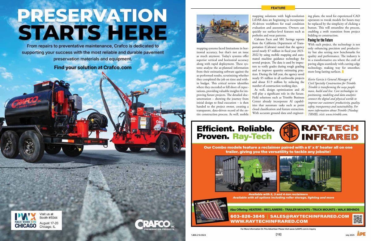 mapping solutions with high-resolution LiDAR data are beginning to incorporate AI-driven workflows for road condition evaluation and assessments. Owners can quickly see surface-level features such as potholes and wear patterns. Caltrans Facts and SB1 Savings reports from the California Department of Transportation( Caltrans) noted that the agency saved nearly $ 7 million in fiscal year 2021- 2022 by using mobile mapping and automated machine guidance technology for several projects. The data is used by inspectors to verify grades during rough grading and to improve quantity estimating practices. During the full year, the agency saved nearly $ 5 million in all earthworks projects and about $ 1.9 million by reducing the number of construction working days. As well, design optimization and AI will play a significant role in the future. Field solutions such as Trimble Business Center already incorporate AI capabilities that automate tasks such as point cloud classification and feature extraction. With accurate ground data and engineering plans, the need for experienced CAD operators to tweak models for hours may be replaced by the simplicity of clicking a button. This will streamline the process, enabling a swift transition from project bidding to construction.