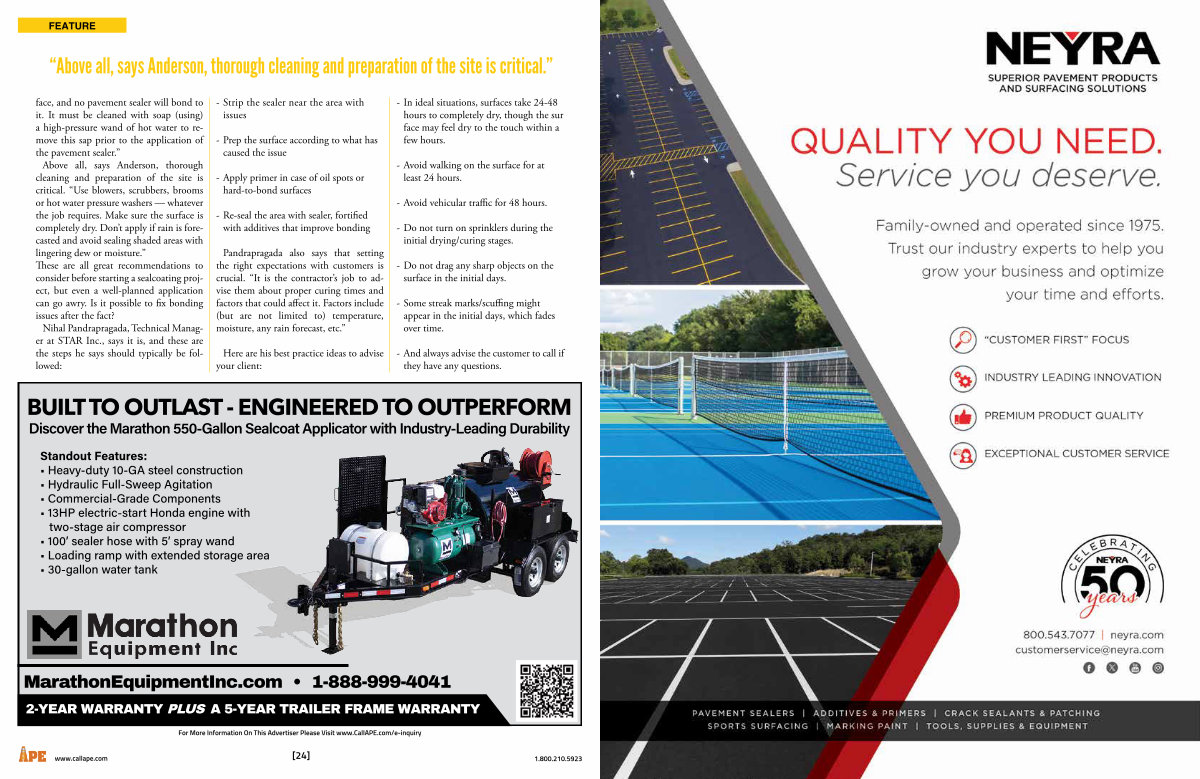 face, and no pavement sealer will bond to it. It must be cleaned with soap( using) a high-pressure wand of hot water to remove this sap prior to the application of the pavement sealer.” Above all, says Anderson, thorough cleaning and preparation of the site is critical.“ Use blowers, scrubbers, brooms or hot water pressure washers— whatever the job requires. Make sure the surface is completely dry. Don’ t apply if rain is forecasted and avoid sealing shaded areas with lingering dew or moisture.” These are all great recommendations to consider before starting a sealcoating project, but even a well-planned application can go awry. Is it possible to fix bonding issues after the fact?