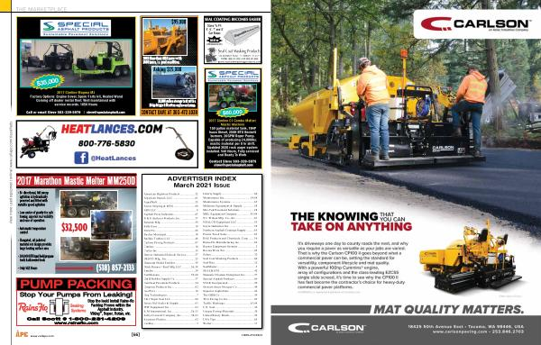 American Highway Products .................... 52 American Stencil , LLC ............................ 61 AquaPhalt .................................................. 53 Arrow Striping & MFG ............................ 60 ARS LLC .................................................... 9 Asphalt Press Industries ............................ 65 B & E Sealcoat Products , Inc .................. 57 Bensink Mfg ............................................. 59 Billy Goat .................................................. 19 BrewPro .................................................... 66 Bucher Municipal ...................................... 18 Buffalo Turbine LLC ................................ 46 Carlson Paving Products ........................... 67 Cimline ..................................................... 10 Crafco Inc ................................................. 35 Denver Industrial Sales & Service ............ 57 DESCO Mfg ., Inc ..................................... 25 Diamond Shield Fortifier .......................... 59 Ditch Runner / Reid Mfg LLC ............. 56,58 Emulso ...................................................... 29 FastMeasure ......................................... 59,60 G & H Rubber Supply Co ........................... 57 GemSeal Pavement Products .................... 24 Gingway Products Inc ............................... 62 Go iPave ................................................... 16 Hog Technologies ....................................... 7 J & J Super Seal LLC ............................... 66 Jersey Girl Sealer & Supply ...................... 61 JFW Equipment Inc .................................. 63 K M International , Inc ......................... 26,51 Kelly-Creswell Company , Inc ............. 58,61 Keystone Plastics ...................................... 62 LeeBoy ........................................................ 3