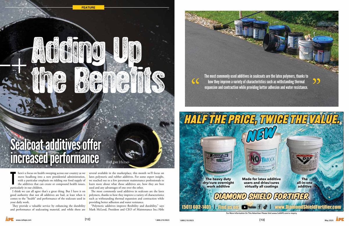 T here’ s a focus on health sweeping across our country as we move headlong into a new presidential administration, with a particular emphasis on ridding our food supply of the additives that can create or compound health issues, particularly in our children. I think we can all agree that’ s a great thing. But I have it on good authority that not all additives are bad, at least when it comes to the“ health” and performance of the sealcoats used in your daily work. They provide a valuable service by enhancing the durability and performance of sealcoating material, and while there are several available in the marketplace, this month we’ ll focus on latex polymeric and rubber additives. For some expert insight, we reached out to a few pavement maintenance professionals to learn more about what those additives are, how they are best used and any advantages of one over the other. The most commonly used additives in sealcoats are the latex polymers, thanks to how they improve a variety of characteristics such as withstanding thermal expansion and contraction while providing better adhesion and water resistance.“ Polymeric additives improve flexibility and durability,” says Mark McLeod, President and CEO of Maintenance Inc./ Able