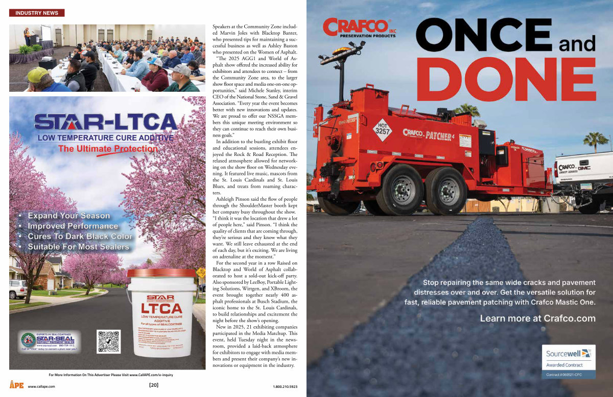Speakers at the Community Zone included Marvin Joles with Blacktop Banter, who presented tips for maintaining a successful business as well as Ashley Baston who presented on the Women of Asphalt.“ The 2025 AGG1 and World of Asphalt show offered the increased ability for exhibitors and attendees to connect – from the Community Zone area, to the larger show floor space and media one-on-one opportunities,” said Michele Stanley, interim CEO of the National Stone, Sand & Gravel Association.“ Every year the event becomes better with new innovations and updates. We are proud to offer our NSSGA members this unique meeting environment so they can continue to reach their own business goals.” In addition to the bustling exhibit floor and educational sessions, attendees enjoyed the Rock & Road Reception. The relaxed atmosphere allowed for networking on the show floor on Wednesday evening. It featured live music, mascots from the St. Louis Cardinals and St. Louis Blues, and treats from roaming characters. Ashleigh Pinson said the flow of people through the ShoulderMaster booth kept her company busy throughout the show.“ I think it was the location that drew a lot of people here,” said Pinson.“ I think the quality of clients that are coming through, they’ re serious and they know what they want. We still leave exhausted at the end of each day, but it’ s exciting. We are living on adrenaline at the moment.” For the second year in a row Raised on Blacktop and World of Asphalt collaborated to host a sold-out kick-off party. Also sponsored by LeeBoy, Portable Lighting Solutions, Wirtgen, and XBroom, the event brought together nearly 400 asphalt professionals at Busch Stadium, the iconic home to the St. Louis Cardinals, to build relationships and excitement the night before the show’ s opening. New in 2025, 21 exhibiting companies participated in the Media Matchup. This event, held Tuesday night in the newsroom, provided a laid-back atmosphere for exhibitors to engage with media members and present their company’ s new innovations or equipment in the industry.