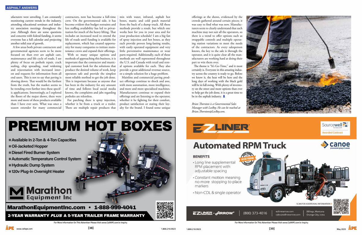 ufacturers were unveiling. I am constantly monitoring current trends in the industry, attending educational seminars and industry association meetings throughout the year. Although there are some questions and concerns with federal funding, it seems everyone has a full calendar and projecting another solid year of growth. A few areas both private contractors and governmental agencies seem to be more focused on than ever are asphalt care, maintenance and life cycle of roads. I see plenty of focus on pothole repair, crack sealing, chip spreading, road widening and rejuvenation with increased interest and requests for information from all end users. This is not to say that paving is slowing down. That would be the farthest from the truth, but the market seems to be trending even further into these specific applications. Interestingly, as I explored the floors of the major shows, there were more and more of these products available than I have ever seen. What was once a season extender for many commercial