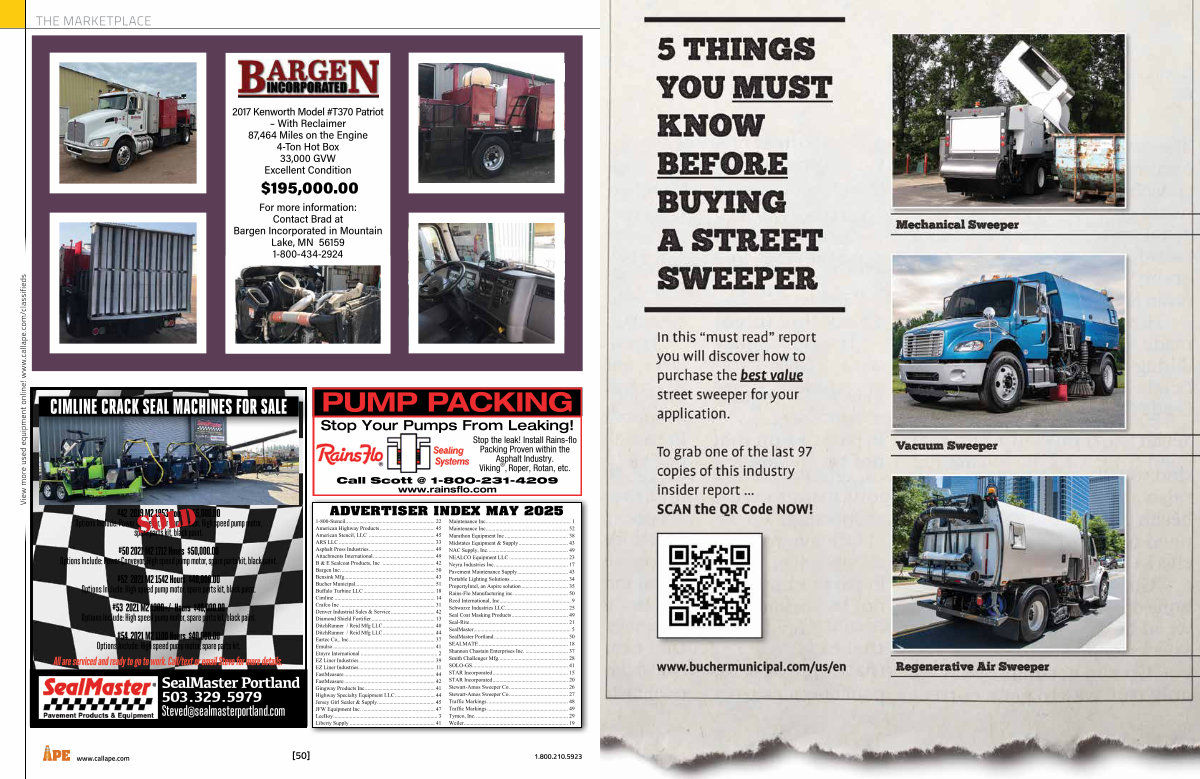 Maintenance Inc............................................................... 1 Maintenance Inc............................................................. 52 Marathon Equipment Inc............................................... 38 Midstates Equipment & Supply..................................... 43 NAC Supply, Inc............................................................ 49 NEALCO Equipment LLC............................................ 23 Neyra Industries Inc....................................................... 17 Pavement Maintenance Supply...................................... 43 Portable Lighting Solutions........................................... 34 PropertyIntel, an Aspire solution................................... 35 Rains-Flo Manufacturing inc......................................... 50 Reed International, Inc..................................................... 9 Schwarze Industries LLC............................................... 25 Seal Coat Masking Products.......................................... 49 Seal-Rite......................................................................... 21 SealMaster........................................................................ 5 SealMaster Portland....................................................... 50 SEALMATE.................................................................. 18 Shannon Chastain Enterprises Inc................................. 37 Smith Challenger Mfg.................................................... 28 SOLO-GS....................................................................... 41 STAR Incorporated........................................................ 15 STAR Incorporated........................................................ 20 Stewart-Amos Sweeper Co............................................ 26 Stewart-Amos Sweeper Co............................................ 27 Traffic Markings............................................................ 48 Traffic Markings............................................................ 49 Tymco, Inc..................................................................... 29 Weiler............................................................................. 19 www. callape. com [ 50 ] 1.800.210.5923