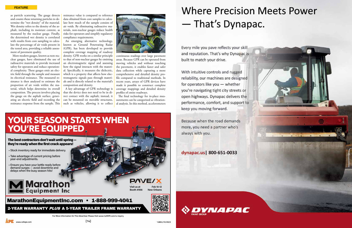 resistance value is compared to reference data obtained from core samples to calculate how much of the sample consists of air voids. By eliminating radioactive materials, non-nuclear gauges reduce health risks for operators and simplify regulatory compliance requirements. An emerging alternative technology, known as Ground Penetrating Radar( GPR), has been developed to provide complete coverage mapping of roadway density. GPR works on a similar principle to that of non-nuclear gauges by emitting an electromagnetic signal and assessing how the signal interacts with the material. Specifically, it measures the dielectric, which is a property that affects how electromagnetic signals pass through materials and is directly related to the material’ s composition and density. A key advantage of GPR technology is that the device does not need to be in direct contact with the asphalt; instead, it can be mounted on movable structures, such as vehicles, allowing it to collect