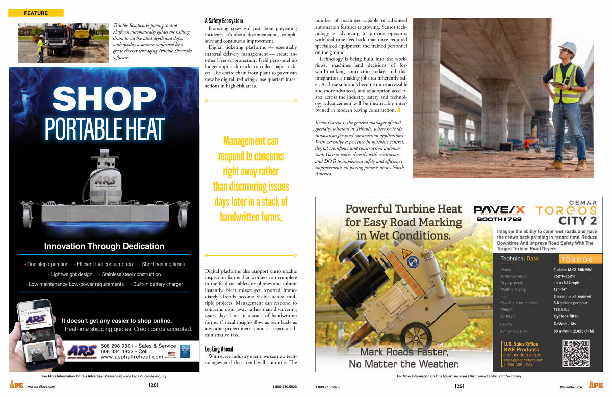 Protecting crews isn’ t just about preventing incidents. It’ s about documentation, compliance and continuous improvement. Digital ticketing platforms— essentially material delivery management— create another layer of protection. Field personnel no longer approach trucks to collect paper tickets. The entire chain from plant to paver can now be digital, reducing close-quarters interactions in high-risk areas.