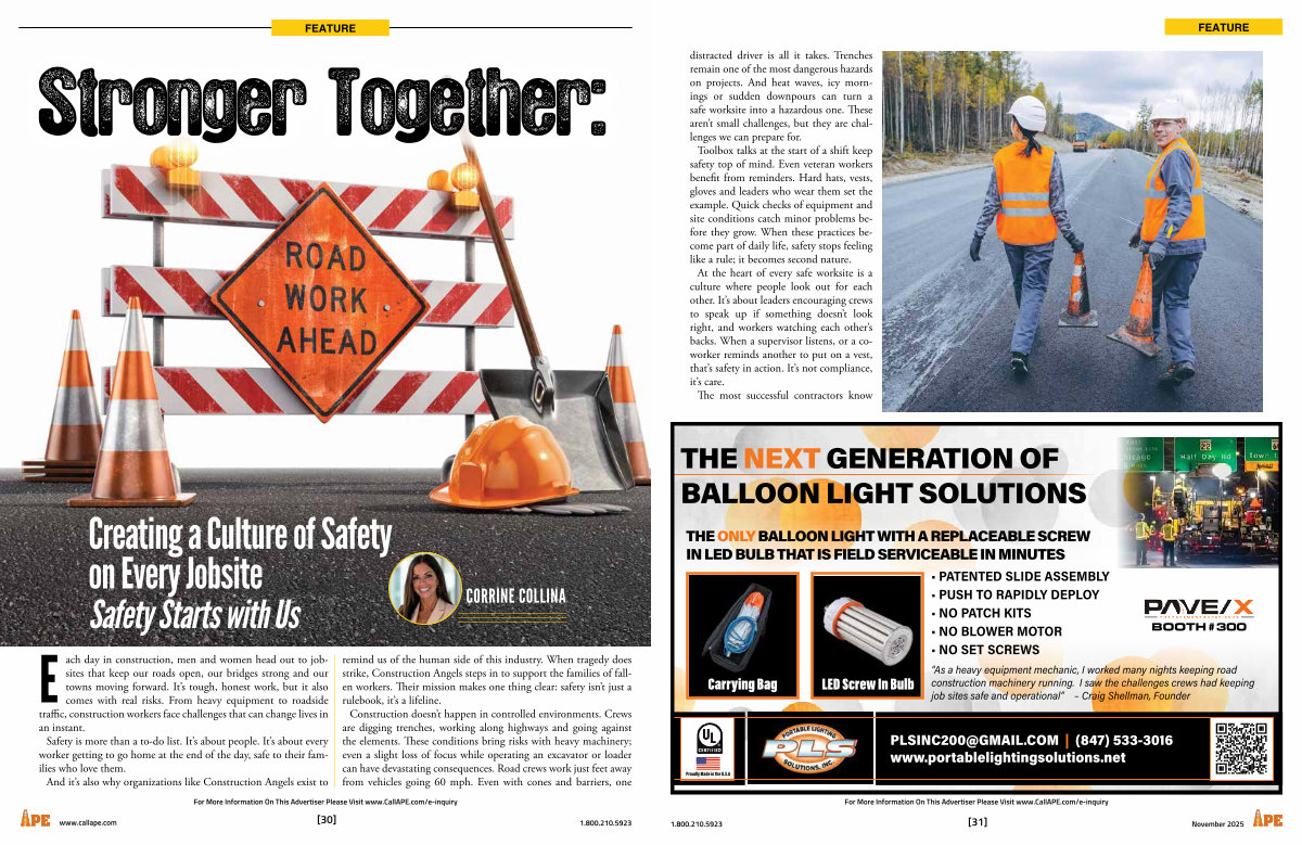 distracted driver is all it takes. Trenches remain one of the most dangerous hazards on projects. And heat waves, icy mornings or sudden downpours can turn a safe worksite into a hazardous one. These aren’ t small challenges, but they are challenges we can prepare for. Toolbox talks at the start of a shift keep safety top of mind. Even veteran workers benefit from reminders. Hard hats, vests, gloves and leaders who wear them set the example. Quick checks of equipment and site conditions catch minor problems before they grow. When these practices become part of daily life, safety stops feeling like a rule; it becomes second nature. At the heart of every safe worksite is a culture where people look out for each other. It’ s about leaders encouraging crews to speak up if something doesn’ t look right, and workers watching each other’ s backs. When a supervisor listens, or a coworker reminds another to put on a vest, that’ s safety in action. It’ s not compliance, it’ s care. The most successful contractors know