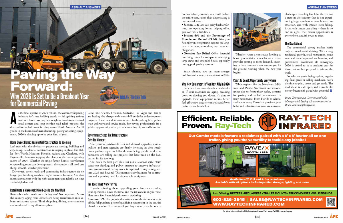 A s the final quarter of 2025 rolls in, the commercial paving industry isn’ t just holding steady— it’ s gaining serious traction. From bustling new neighborhoods to revitalized retail centers and long-overdue road rehab projects, the demand for asphalt work is rising across North America. And if you’ re in the business of manufacturing, paving or selling equipment, 2026 is shaping up to be your kind of year.