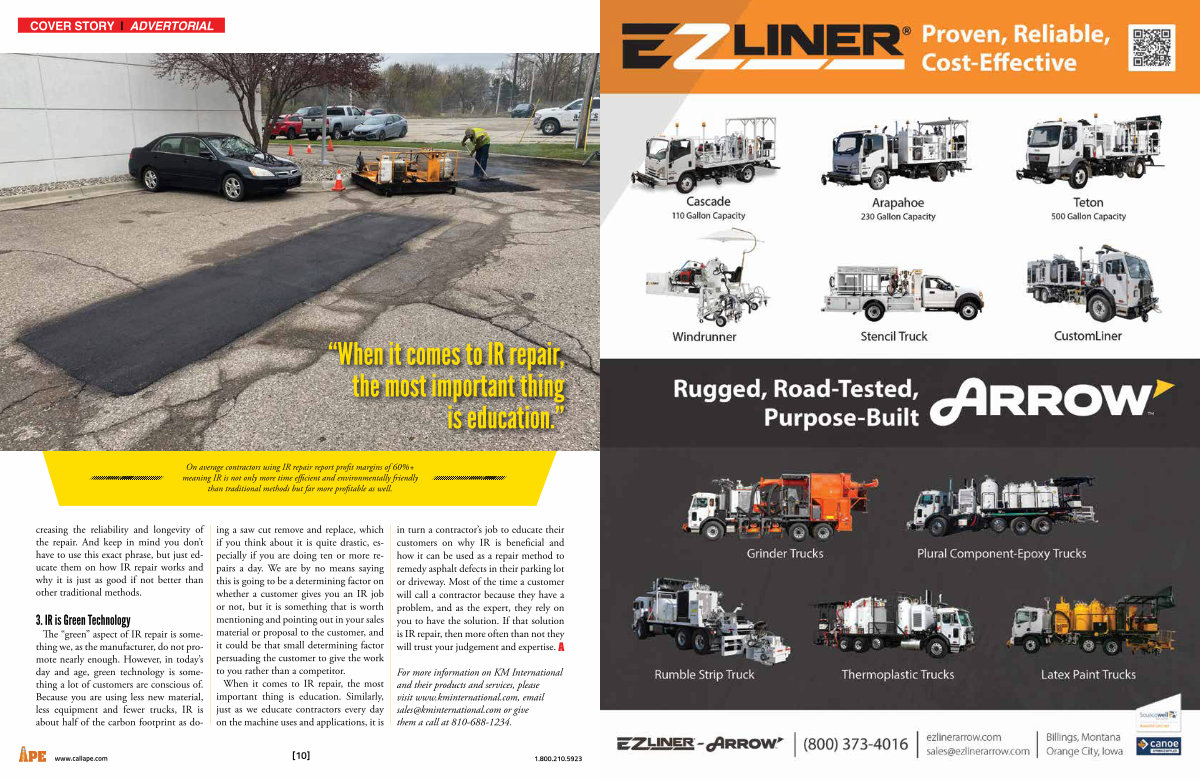The“ green” aspect of IR repair is something we, as the manufacturer, do not promote nearly enough. However, in today’ s day and age, green technology is something a lot of customers are conscious of. Because you are using less new material, less equipment and fewer trucks, IR is about half of the carbon footprint as doing a saw cut remove and replace, which if you think about it is quite drastic, especially if you are doing ten or more repairs a day. We are by no means saying this is going to be a determining factor on whether a customer gives you an IR job or not, but it is something that is worth mentioning and pointing out in your sales material or proposal to the customer, and it could be that small determining factor persuading the customer to give the work to you rather than a competitor. When it comes to IR repair, the most important thing is education. Similarly, just as we educate contractors every day on the machine uses and applications, it is in turn a contractor’ s job to educate their customers on why IR is beneficial and how it can be used as a repair method to remedy asphalt defects in their parking lot or driveway. Most of the time a customer will call a contractor because they have a problem, and as the expert, they rely on you to have the solution. If that solution is IR repair, then more often than not they will trust your judgement and expertise.