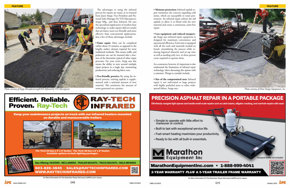 FEATURE The advantages to using the infrared process for repairs are many, as we learned from Jason Stepp, Vice President and National Sales Manager for VSS Macropaver, Stepp Mfg., and Kasi Infrared. He says the specialized application of modern heat technology to make repairs delivers results that are faster, more eco-friendly and more effective than conventional applications. Just a few of those advantages include: