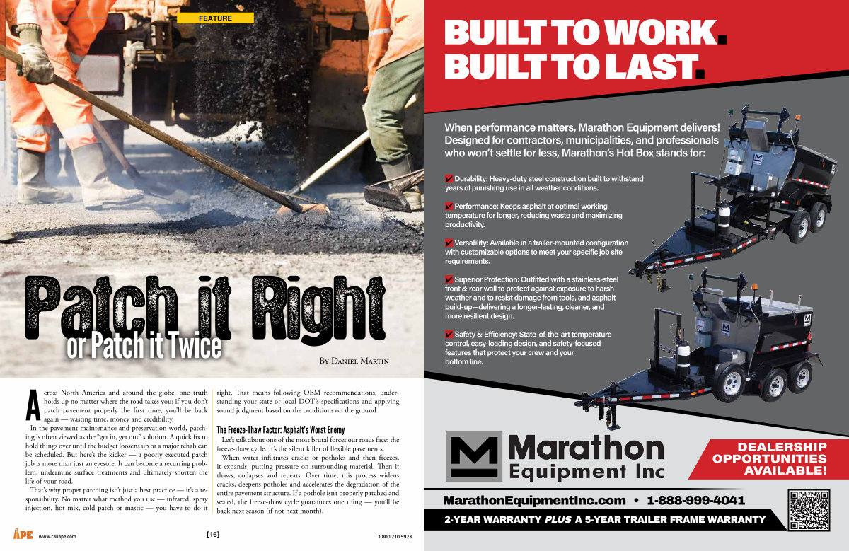 Across North America and around the globe, one truth holds up no matter where the road takes you: if you don’ t patch pavement properly the first time, you’ ll be back again— wasting time, money and credibility. In the pavement maintenance and preservation world, patching is often viewed as the“ get in, get out” solution. A quick fix to hold things over until the budget loosens up or a major rehab can be scheduled. But here’ s the kicker— a poorly executed patch job is more than just an eyesore. It can become a recurring problem, undermine surface treatments and ultimately shorten the life of your road. That’ s why proper patching isn’ t just a best practice— it’ s a responsibility. No matter what method you use— infrared, spray injection, hot mix, cold patch or mastic— you have to do it right. That means following OEM recommendations, understanding your state or local DOT’ s specifications and applying sound judgment based on the conditions on the ground.