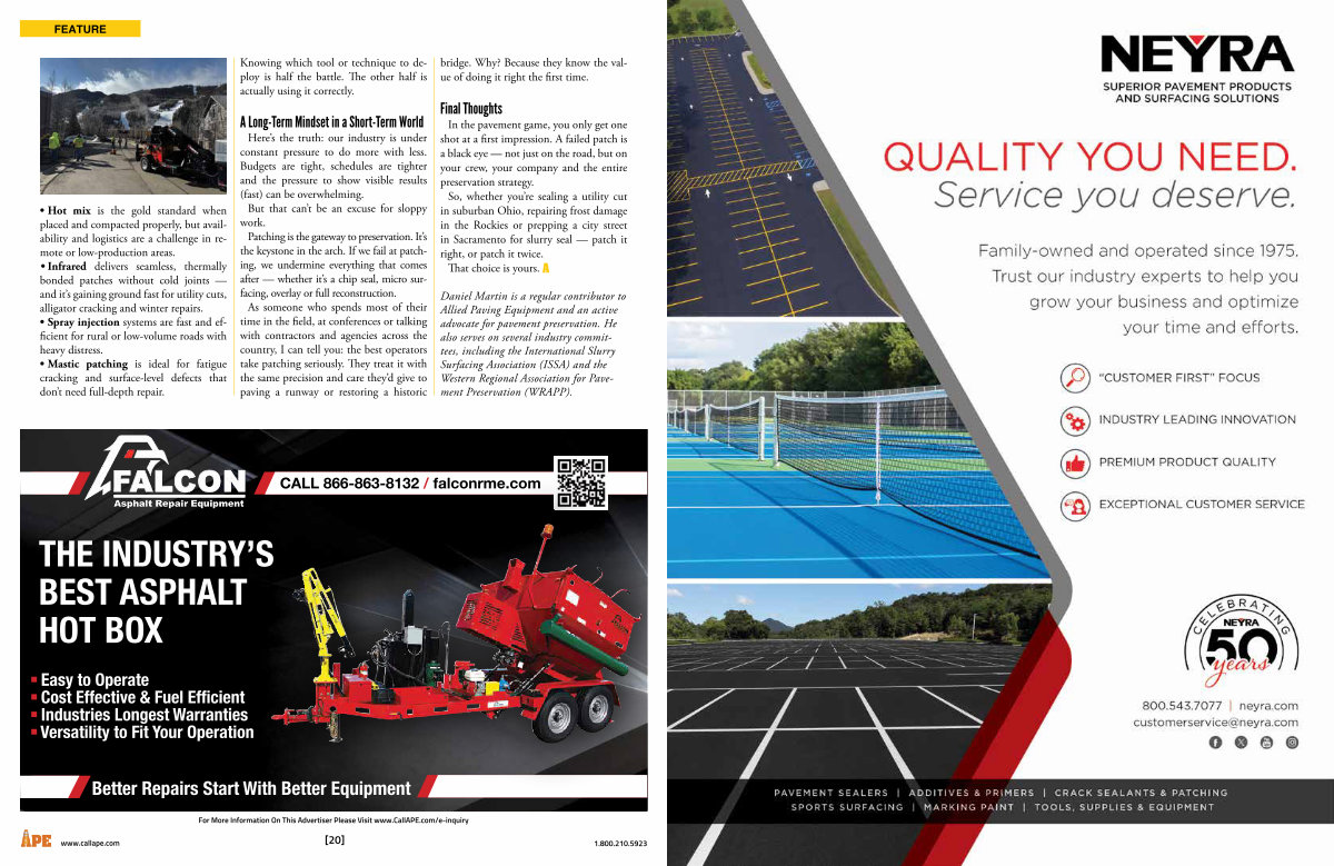 Here’ s the truth: our industry is under constant pressure to do more with less. Budgets are tight, schedules are tighter and the pressure to show visible results( fast) can be overwhelming. But that can’ t be an excuse for sloppy work. Patching is the gateway to preservation. It’ s the keystone in the arch. If we fail at patching, we undermine everything that comes after— whether it’ s a chip seal, micro surfacing, overlay or full reconstruction. As someone who spends most of their time in the field, at conferences or talking with contractors and agencies across the country, I can tell you: the best operators take patching seriously. They treat it with the same precision and care they’ d give to paving a runway or restoring a historic