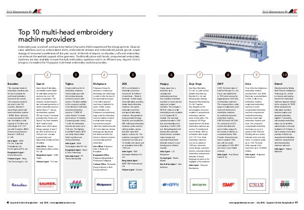 This Japanese leader of embroidery machines was the first to produce the multi-head embroidery machine in the country. The company’ s products are used in over 100 countries. Barudan’ s newest high speed multihead embroidery machine – BEKS Series, achieves a maximum speed of 1000 rpm. Facilitating a stitch capacity of 70 million and stitch length of 0.1-12.7 mm with 9 needles, BEKS Series consumes power between 1.5 kW and 2.1 kW.