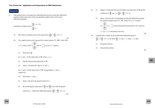 www . seprodstore . com 315 20 ( c ) ( 1 ) Suggest a relationship between the distinct real eigenvalues of M and the coefficients of d d y x andyin 2 2 d d 4 12 0 d d y y y x x � � � . ( 2 ) Hence , write down the corresponding second-order differential equation for a general coupled system � Y NY , where N is a 2 2 � matrix , d d d d v x y x � � � � � � � � � � � � � Y , v y � � � �� � � Y , and the characteristic polynomial of N is given by 2 0 b c � � � � � with distinct real roots . [ 4 ] ( d ) Using the above results , for the second-order differential equation 2 2 d d 12 27 0 d d y y y x x � � � for which d 15 d y x �and3y�when0x�,find ( 1 ) the general solution ; ( 2 ) the particular solution . [ 8 ]