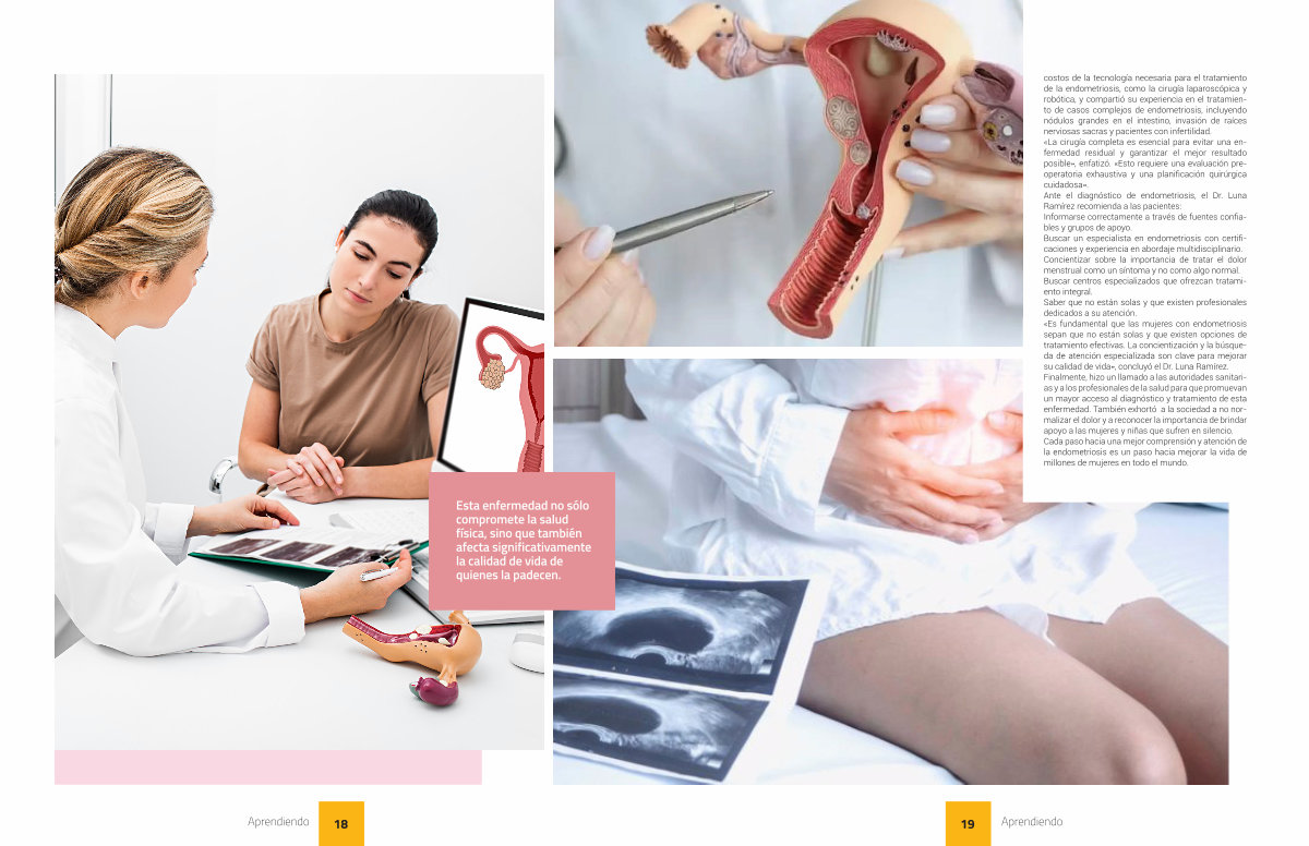 costos de la tecnología necesaria para el tratamiento de la endometriosis, como la cirugía laparoscópica y robótica, y compartió su experiencia en el tratamiento de casos complejos de endometriosis, incluyendo nódulos grandes en el intestino, invasión de raíces nerviosas sacras y pacientes con infertilidad. « La cirugía completa es esencial para evitar una enfermedad residual y garantizar el mejor resultado posible », enfatizó. « Esto requiere una evaluación preoperatoria exhaustiva y una planificación quirúrgica cuidadosa ». Ante el diagnóstico de endometriosis, el Dr. Luna Ramírez recomienda a las pacientes: Informarse correctamente a través de fuentes confiables y grupos de apoyo. Buscar un especialista en endometriosis con certificaciones y experiencia en abordaje multidisciplinario. Concientizar sobre la importancia de tratar el dolor menstrual como un síntoma y no como algo normal. Buscar centros especializados que ofrezcan tratamiento integral. Saber que no están solas y que existen profesionales dedicados a su atención. « Es fundamental que las mujeres con endometriosis sepan que no están solas y que existen opciones de tratamiento efectivas. La concientización y la búsqueda de atención especializada son clave para mejorar su calidad de vida », concluyó el Dr. Luna Ramírez. Finalmente, hizo un llamado a las autoridades sanitarias y a los profesionales de la salud para que promuevan un mayor acceso al diagnóstico y tratamiento de esta enfermedad. También exhortó a la sociedad a no normalizar el dolor y a reconocer la importancia de brindar apoyo a las mujeres y niñas que sufren en silencio. Cada paso hacia una mejor comprensión y atención de la endometriosis es un paso hacia mejorar la vida de millones de mujeres en todo el mundo.