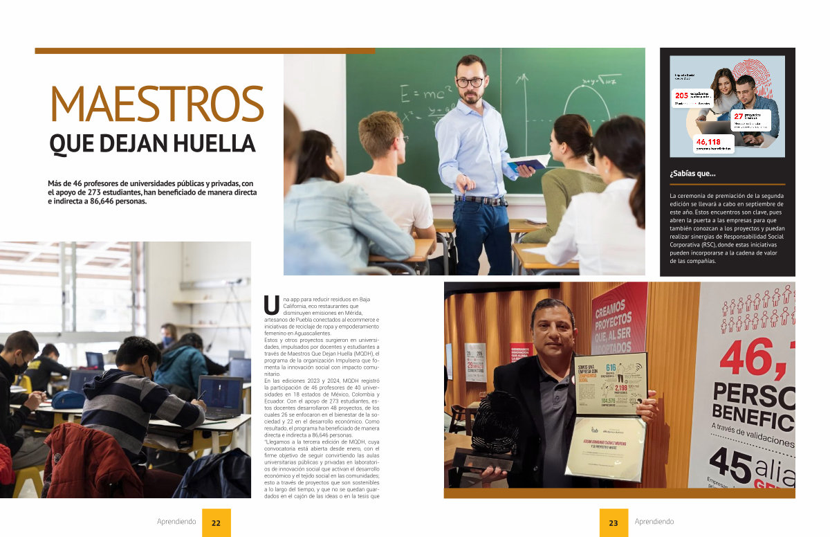 Una app para reducir residuos en Baja California, eco restaurantes que disminuyen emisiones en Mérida, artesanos de Puebla conectados al ecommerce e iniciativas de reciclaje de ropa y empoderamiento femenino en Aguascalientes. Estos y otros proyectos surgieron en universidades, impulsados por docentes y estudiantes a través de Maestros Que Dejan Huella( MQDH), el programa de la organización Impulsera que fomenta la innovación social con impacto comunitario. En las ediciones 2023 y 2024, MQDH registró la participación de 46 profesores de 40 universidades en 18 estados de México, Colombia y Ecuador. Con el apoyo de 273 estudiantes, estos docentes desarrollaron 48 proyectos, de los cuales 26 se enfocaron en el bienestar de la sociedad y 22 en el desarrollo económico. Como resultado, el programa ha beneficiado de manera directa e indirecta a 86,646 personas.“ Llegamos a la tercera edición de MQDH, cuya convocatoria está abierta desde enero, con el firme objetivo de seguir convirtiendo las aulas universitarias públicas y privadas en laboratorios de innovación social que activan el desarrollo económico y el tejido social en las comunidades; esto a través de proyectos que son sostenibles a lo largo del tiempo, y que no se quedan guardados en el cajón de las ideas o en la tesis que