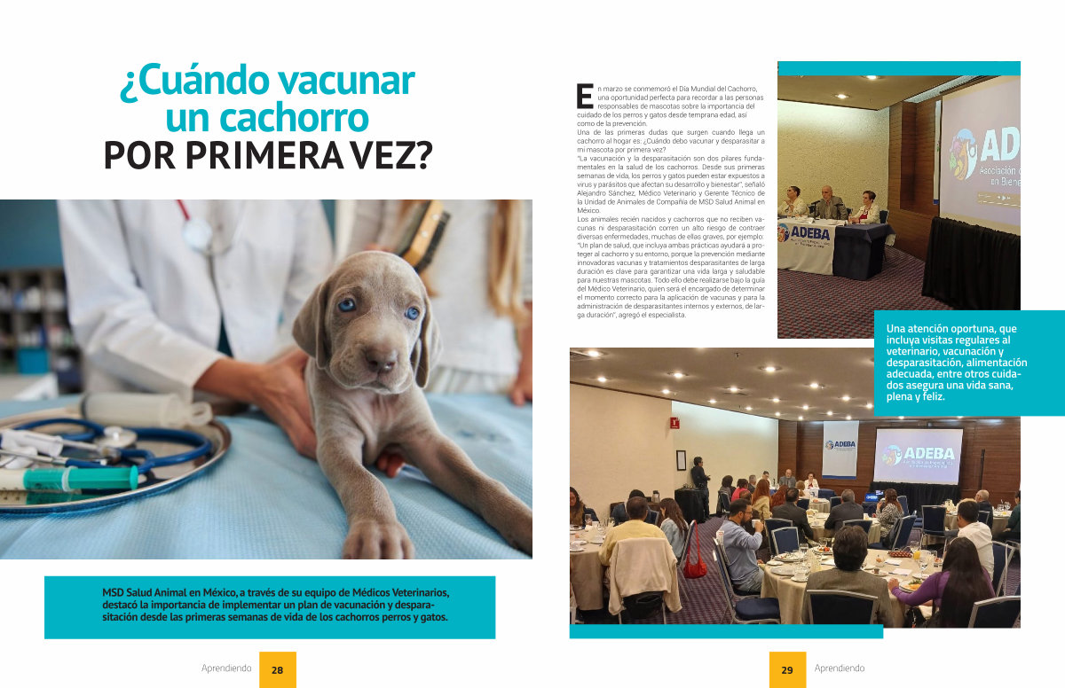 En marzo se conmemoró el Día Mundial del Cachorro, una oportunidad perfecta para recordar a las personas responsables de mascotas sobre la importancia del cuidado de los perros y gatos desde temprana edad, así como de la prevención. Una de las primeras dudas que surgen cuando llega un cachorro al hogar es: ¿ Cuándo debo vacunar y desparasitar a mi mascota por primera vez?“ La vacunación y la desparasitación son dos pilares fundamentales en la salud de los cachorros. Desde sus primeras semanas de vida, los perros y gatos pueden estar expuestos a virus y parásitos que afectan su desarrollo y bienestar”, señaló Alejandro Sánchez, Médico Veterinario y Gerente Técnico de la Unidad de Animales de Compañía de MSD Salud Animal en México. Los animales recién nacidos y cachorros que no reciben vacunas ni desparasitación corren un alto riesgo de contraer diversas enfermedades, muchas de ellas graves, por ejemplo:“ Un plan de salud, que incluya ambas prácticas ayudará a proteger al cachorro y su entorno, porque la prevención mediante innovadoras vacunas y tratamientos desparasitantes de larga duración es clave para garantizar una vida larga y saludable para nuestras mascotas. Todo ello debe realizarse bajo la guía del Médico Veterinario, quien será el encargado de determinar el momento correcto para la aplicación de vacunas y para la administración de desparasitantes internos y externos, de larga duración”, agregó el especialista.