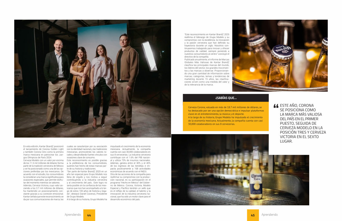 ESTE AÑO, CORONA SE POSICIONA COMO LA MARCA MÁS VALIOSA DEL PAÍS EN EL PRIMER PUESTO, SEGUIDA DE CERVEZA MODELO EN LA POSICIÓN TRES Y CERVEZA VICTORIA EN EL SEXTO LUGAR.