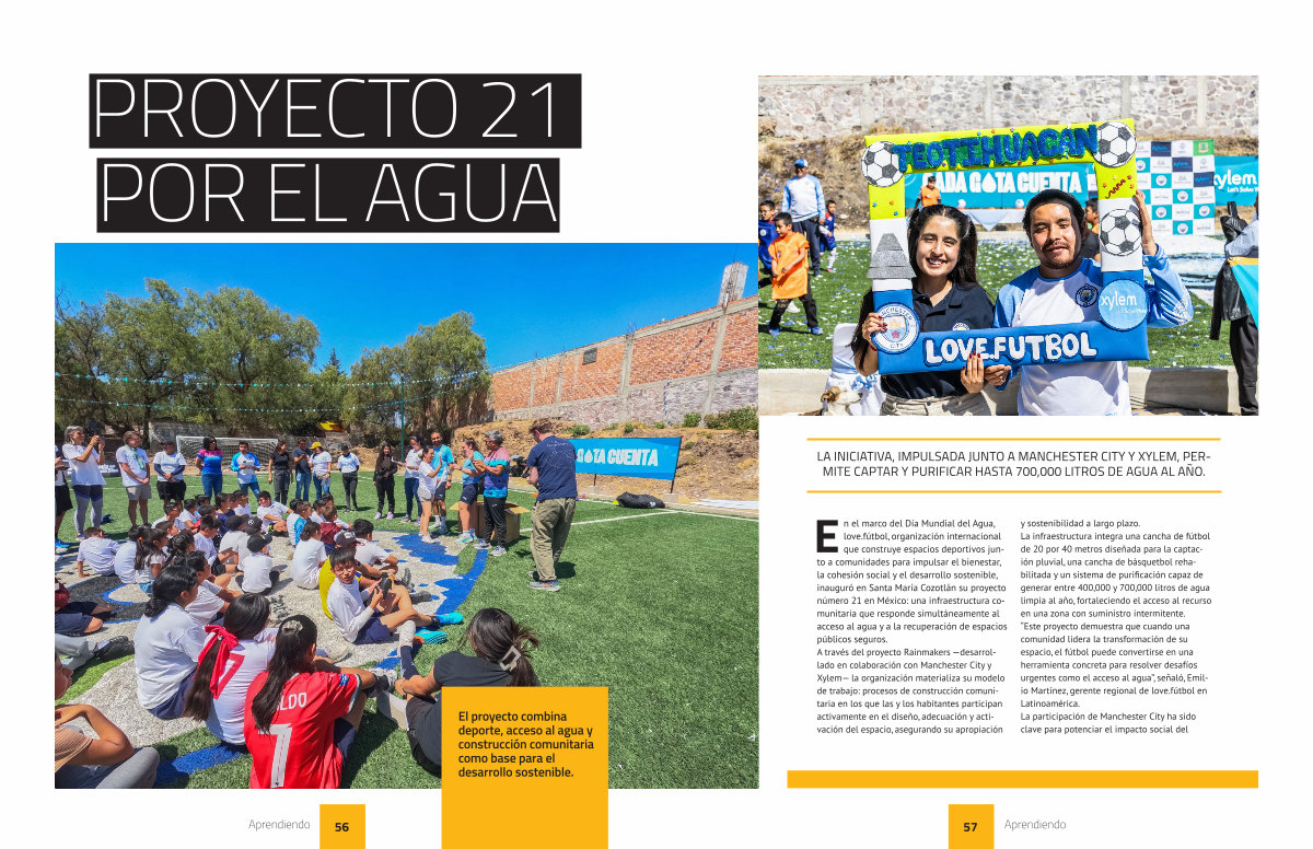 En el marco del Día Mundial del Agua, love. fútbol, organización internacional que construye espacios deportivos junto a comunidades para impulsar el bienestar, la cohesión social y el desarrollo sostenible, inauguró en Santa María Cozotlán su proyecto número 21 en México: una infraestructura comunitaria que responde simultáneamente al acceso al agua y a la recuperación de espacios públicos seguros. A través del proyecto Rainmakers— desarrollado en colaboración con Manchester City y Xylem— la organización materializa su modelo de trabajo: procesos de construcción comunitaria en los que las y los habitantes participan activamente en el diseño, adecuación y activación del espacio, asegurando su apropiación y sostenibilidad a largo plazo. La infraestructura integra una cancha de fútbol de 20 por 40 metros diseñada para la captación pluvial, una cancha de básquetbol rehabilitada y un sistema de purificación capaz de generar entre 400,000 y 700,000 litros de agua limpia al año, fortaleciendo el acceso al recurso en una zona con suministro intermitente.“ Este proyecto demuestra que cuando una comunidad lidera la transformación de su espacio, el fútbol puede convertirse en una herramienta concreta para resolver desafíos urgentes como el acceso al agua”, señaló, Emilio Martínez, gerente regional de love. fútbol en Latinoamérica. La participación de Manchester City ha sido clave para potenciar el impacto social del