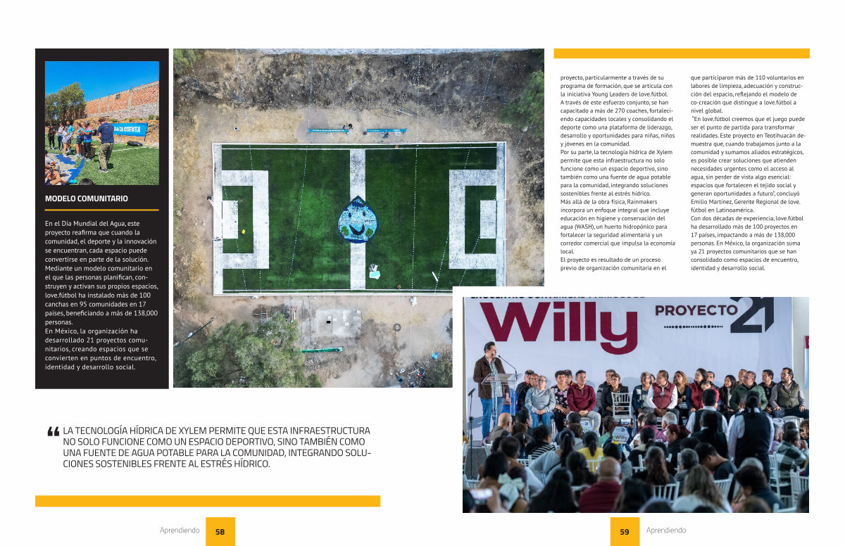 proyecto, particularmente a través de su programa de formación, que se articula con la iniciativa Young Leaders de love. fútbol. A través de este esfuerzo conjunto, se han capacitado a más de 270 coaches, fortaleciendo capacidades locales y consolidando el deporte como una plataforma de liderazgo, desarrollo y oportunidades para niñas, niños y jóvenes en la comunidad. Por su parte, la tecnología hídrica de Xylem permite que esta infraestructura no solo funcione como un espacio deportivo, sino también como una fuente de agua potable para la comunidad, integrando soluciones sostenibles frente al estrés hídrico. Más allá de la obra física, Rainmakers incorpora un enfoque integral que incluye educación en higiene y conservación del agua( WASH), un huerto hidropónico para fortalecer la seguridad alimentaria y un corredor comercial que impulsa la economía local. El proyecto es resultado de un proceso previo de organización comunitaria en el que participaron más de 110 voluntarios en labores de limpieza, adecuación y construcción del espacio, reflejando el modelo de co-creación que distingue a love. fútbol a nivel global.“ En love. fútbol creemos que el juego puede ser el punto de partida para transformar realidades. Este proyecto en Teotihuacán demuestra que, cuando trabajamos junto a la comunidad y sumamos aliados estratégicos, es posible crear soluciones que atienden necesidades urgentes como el acceso al agua, sin perder de vista algo esencial: espacios que fortalecen el tejido social y generan oportunidades a futuro”, concluyó Emilio Martínez, Gerente Regional de love. fútbol en Latinoamérica. Con dos décadas de experiencia, love. fútbol ha desarrollado más de 100 proyectos en 17 países, impactando a más de 138,000 personas. En México, la organización suma ya 21 proyectos comunitarios que se han consolidado como espacios de encuentro, identidad y desarrollo social.