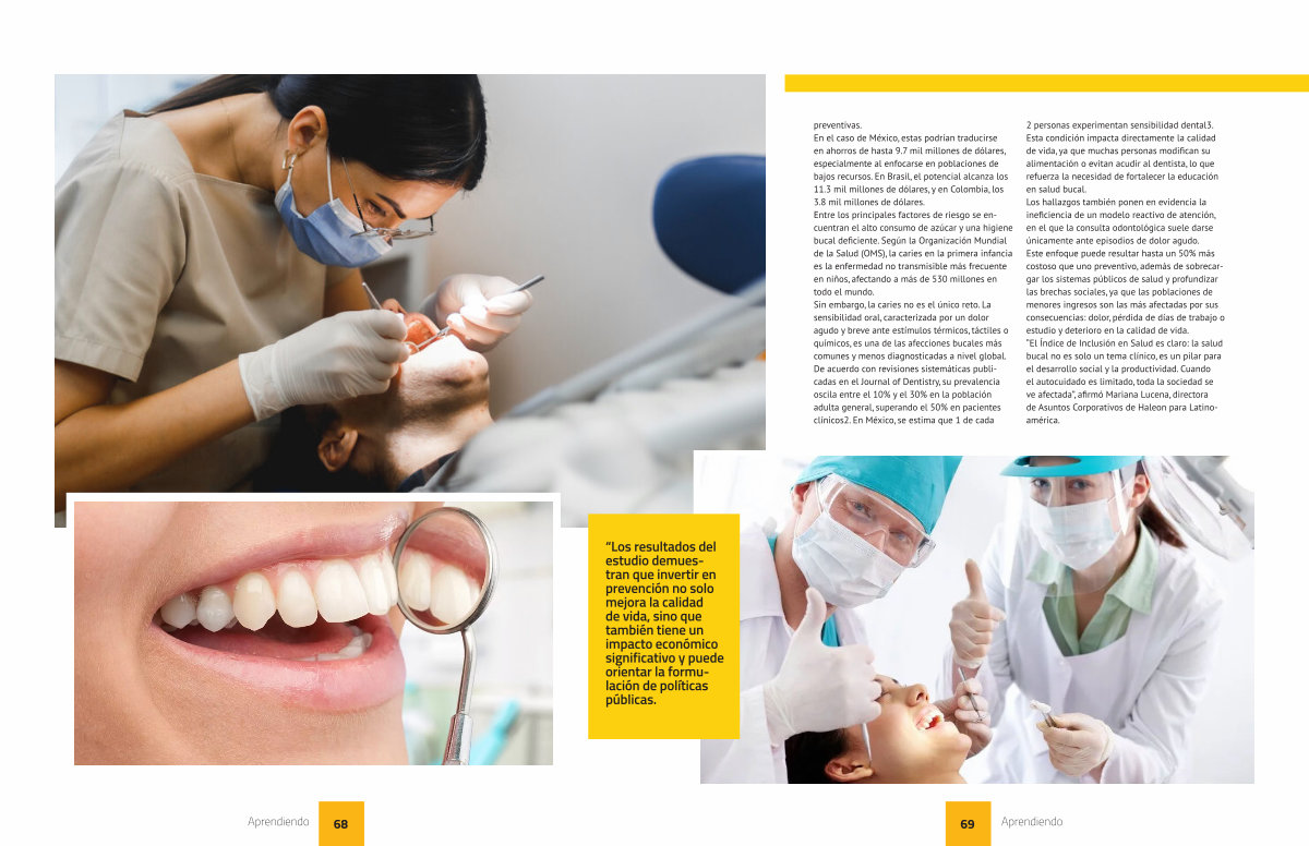 preventivas. En el caso de México, estas podrían traducirse en ahorros de hasta 9.7 mil millones de dólares, especialmente al enfocarse en poblaciones de bajos recursos. En Brasil, el potencial alcanza los 11.3 mil millones de dólares, y en Colombia, los 3.8 mil millones de dólares. Entre los principales factores de riesgo se encuentran el alto consumo de azúcar y una higiene bucal deficiente. Según la Organización Mundial de la Salud( OMS), la caries en la primera infancia es la enfermedad no transmisible más frecuente en niños, afectando a más de 530 millones en todo el mundo. Sin embargo, la caries no es el único reto. La sensibilidad oral, caracterizada por un dolor agudo y breve ante estímulos térmicos, táctiles o químicos, es una de las afecciones bucales más comunes y menos diagnosticadas a nivel global. De acuerdo con revisiones sistemáticas publicadas en el Journal of Dentistry, su prevalencia oscila entre el 10 % y el 30 % en la población adulta general, superando el 50 % en pacientes clínicos2. En México, se estima que 1 de cada
