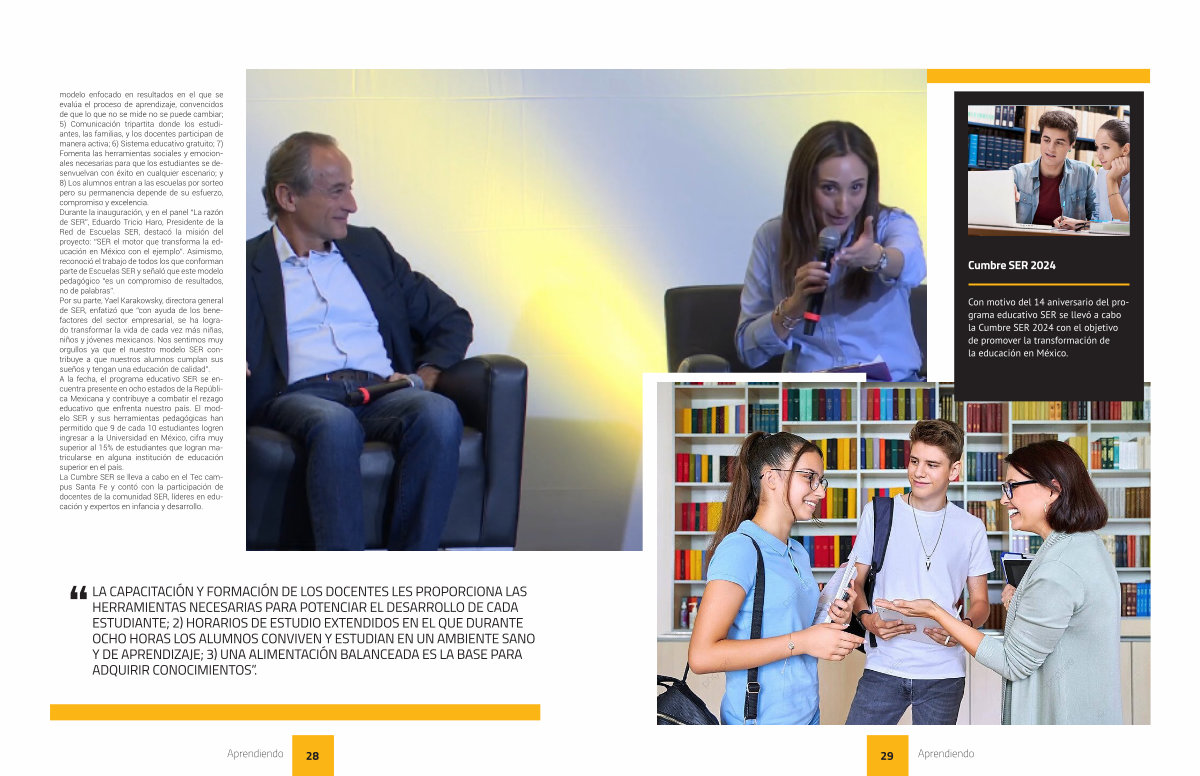 modelo enfocado en resultados en el que se evalúa el proceso de aprendizaje , convencidos de que lo que no se mide no se puede cambiar ; 5 ) Comunicación tripartita donde los estudiantes , las familias , y los docentes participan de manera activa ; 6 ) Sistema educativo gratuito ; 7 ) Fomenta las herramientas sociales y emocionales necesarias para que los estudiantes se desenvuelvan con éxito en cualquier escenario ; y 8 ) Los alumnos entran a las escuelas por sorteo pero su permanencia depende de su esfuerzo , compromiso y excelencia . Durante la inauguración , y en el panel “ La razón de SER ”, Eduardo Tricio Haro , Presidente de la Red de Escuelas SER , destacó la misión del proyecto : “ SER el motor que transforma la educación en México con el ejemplo ”. Asimismo , reconoció el trabajo de todos los que conforman parte de Escuelas SER y señaló que este modelo pedagógico “ es un compromiso de resultados , no de palabras ”. Por su parte , Yael Karakowsky , directora general de SER , enfatizó que “ con ayuda de los benefactores del sector empresarial , se ha logrado transformar la vida de cada vez más niñas , niños y jóvenes mexicanos . Nos sentimos muy orgullos ya que el nuestro modelo SER contribuye a que nuestros alumnos cumplan sus sueños y tengan una educación de calidad ”. A la fecha , el programa educativo SER se encuentra presente en ocho estados de la República Mexicana y contribuye a combatir el rezago educativo que enfrenta nuestro país . El modelo SER y sus herramientas pedagógicas han permitido que 9 de cada 10 estudiantes logren ingresar a la Universidad en México , cifra muy superior al 15 % de estudiantes que logran matricularse en alguna institución de educación superior en el país . La Cumbre SER se lleva a cabo en el Tec campus Santa Fe y contó con la participación de docentes de la comunidad SER , líderes en educación y expertos en infancia y desarrollo .