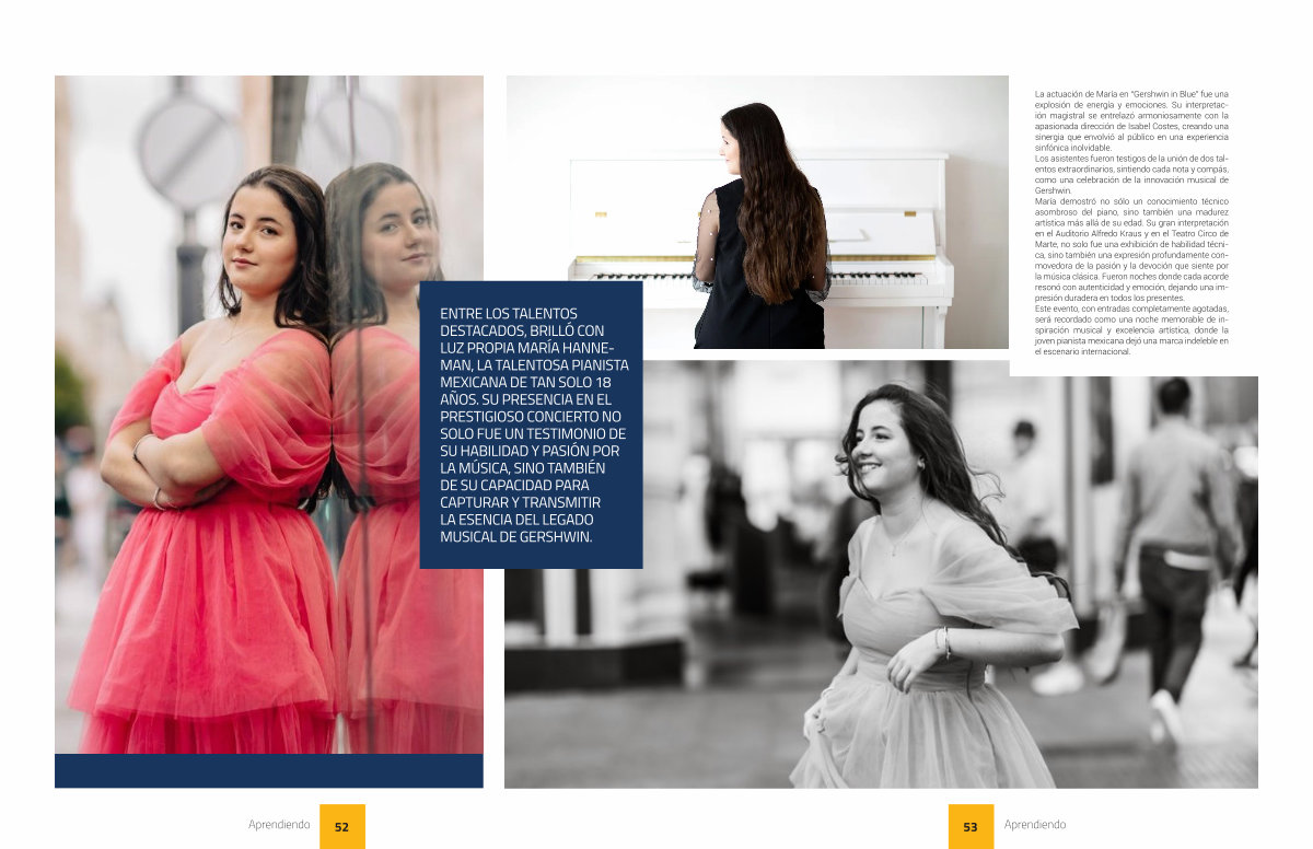 ENTRE LOS TALENTOS DESTACADOS , BRILLÓ CON LUZ PROPIA MARÍA HANNE- MAN , LA TALENTOSA PIANISTA MEXICANA DE TAN SOLO 18 AÑOS . SU PRESENCIA EN EL PRESTIGIOSO CONCIERTO NO SOLO FUE UN TESTIMONIO DE SU HABILIDAD Y PASIÓN POR LA MÚSICA , SINO TAMBIÉN DE SU CAPACIDAD PARA CAPTURAR Y TRANSMITIR LA ESENCIA DEL LEGADO MUSICAL DE GERSHWIN .
