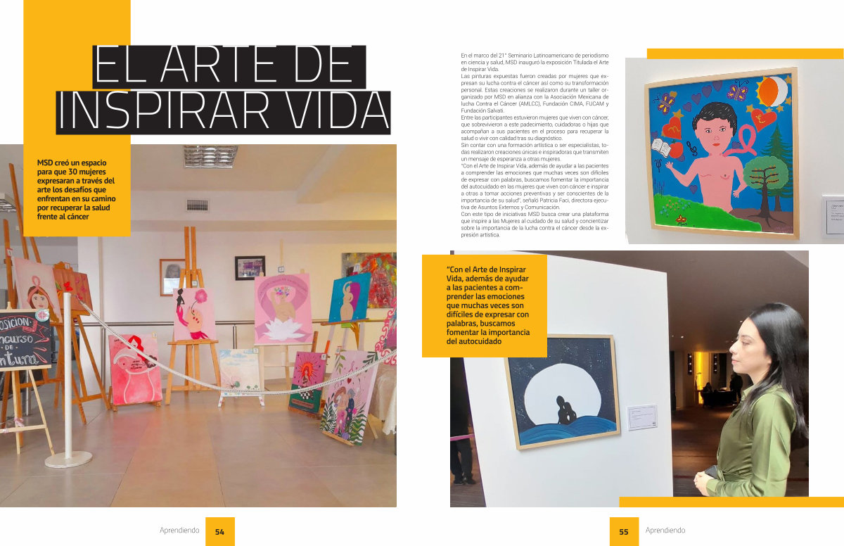 En el marco del 21 ° Seminario Latinoamericano de periodismo en ciencia y salud , MSD inauguró la exposición Titulada el Arte de Inspirar Vida . Las pinturas expuestas fueron creadas por mujeres que expresan su lucha contra el cáncer así como su transformación personal . Estas creaciones se realizaron durante un taller organizado por MSD en alianza con la Asociación Mexicana de lucha Contra el Cáncer ( AMLCC ), Fundación CIMA , FUCAM y Fundación Salvati . Entre las participantes estuvieron mujeres que viven con cáncer , que sobrevivieron a este padecimiento , cuidadoras o hijas que acompañan a sus pacientes en el proceso para recuperar la salud o vivir con calidad tras su diagnóstico . Sin contar con una formación artística o ser especialistas , todas realizaron creaciones únicas e inspiradoras que transmiten un mensaje de esperanza a otras mujeres . “ Con el Arte de Inspirar Vida , además de ayudar a las pacientes a comprender las emociones que muchas veces son difíciles de expresar con palabras , buscamos fomentar la importancia del autocuidado en las mujeres que viven con cáncer e inspirar a otras a tomar acciones preventivas y ser conscientes de la importancia de su salud ”, señaló Patricia Faci , directora ejecutiva de Asuntos Externos y Comunicación . Con este tipo de iniciativas MSD busca crear una plataforma que inspire a las Mujeres al cuidado de su salud y concientizar sobre la importancia de la lucha contra el cáncer desde la expresión artística .