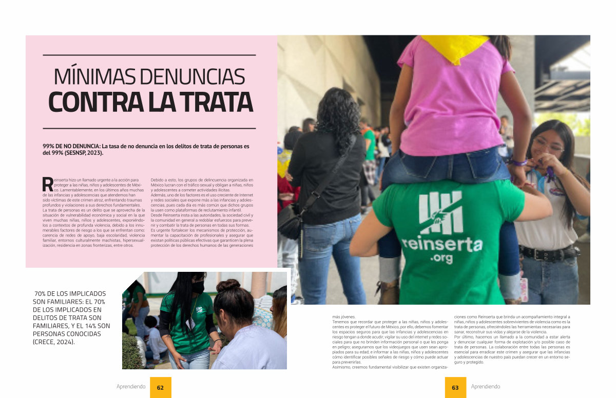 Reinserta hizo un llamado urgente a la acción para proteger a las niñas , niños y adolescentes de México . Lamentablemente , en los últimos años muchas de las infancias y adolescencias que atendemos han sido víctimas de este crimen atroz , enfrentando traumas profundos y violaciones a sus derechos fundamentales . La trata de personas es un delito que se aprovecha de la situación de vulnerabilidad económica y social en la que viven muchas niñas , niños y adolescentes , exponiéndolos a contextos de profunda violencia , debido a los innumerables factores de riesgo a los que se enfrentan como : carencia de redes de apoyo , baja escolaridad , violencia familiar , entornos culturalmente machistas , hipersexualización , residencia en zonas fronterizas , entre otros .