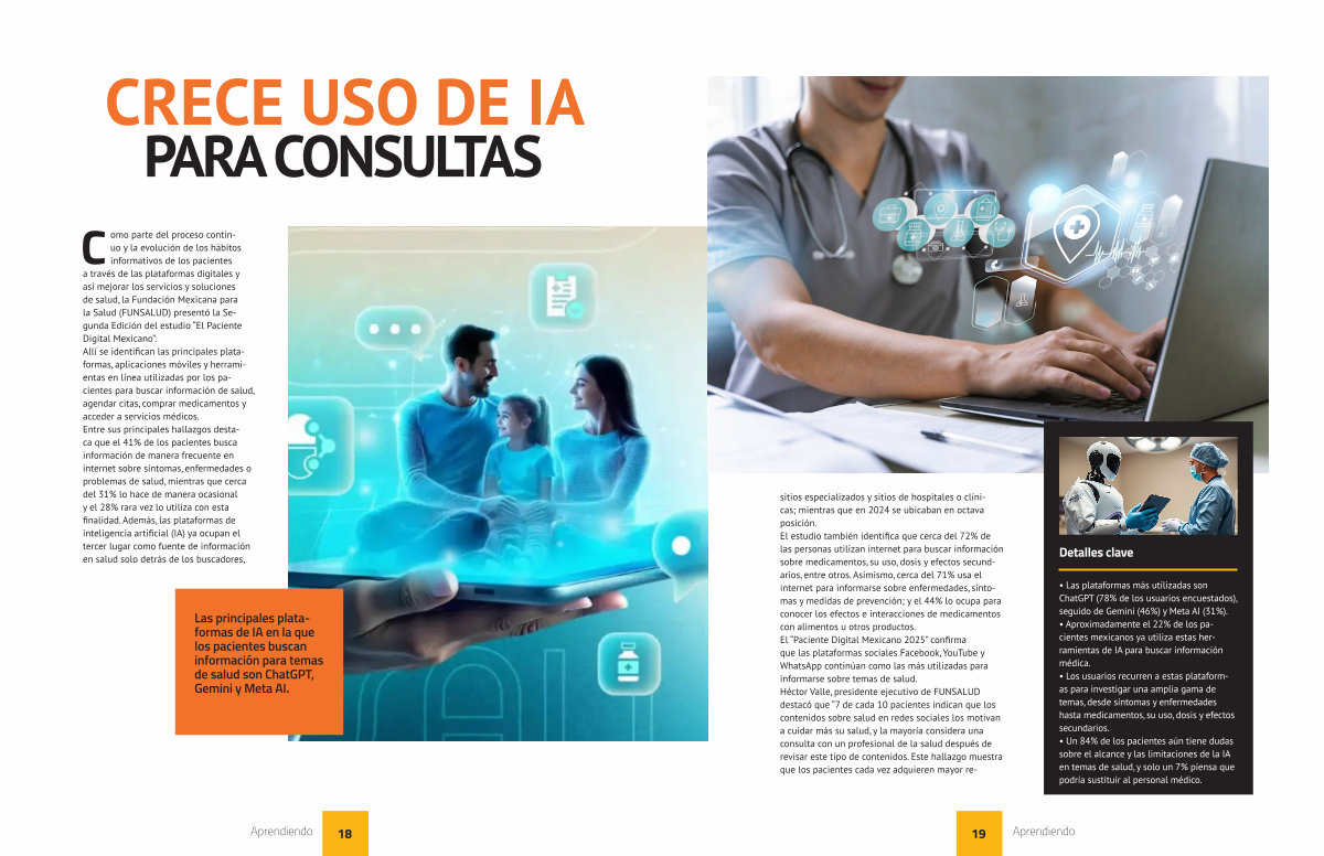 sitios especializados y sitios de hospitales o clínicas; mientras que en 2024 se ubicaban en octava posición. El estudio también identifica que cerca del 72 % de las personas utilizan internet para buscar información sobre medicamentos, su uso, dosis y efectos secundarios, entre otros. Asimismo, cerca del 71 % usa el internet para informarse sobre enfermedades, síntomas y medidas de prevención; y el 44 % lo ocupa para conocer los efectos e interacciones de medicamentos con alimentos u otros productos. El“ Paciente Digital Mexicano 2025” confirma que las plataformas sociales Facebook, YouTube y WhatsApp continúan como las más utilizadas para informarse sobre temas de salud. Héctor Valle, presidente ejecutivo de FUNSALUD destacó que“ 7 de cada 10 pacientes indican que los contenidos sobre salud en redes sociales los motivan a cuidar más su salud, y la mayoría considera una consulta con un profesional de la salud después de revisar este tipo de contenidos. Este hallazgo muestra que los pacientes cada vez adquieren mayor re-