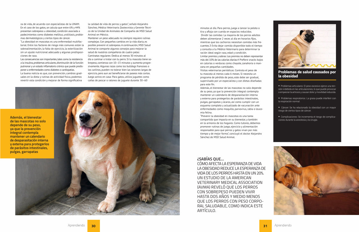minutos al día. Para perros, juega a lanzar la pelota o tira y afloja con cuerda en espacios reducidos. Dividir las comidas: La mayoría de los perros adultos deben alimentarse 2 veces al día en horarios fijos, mientras que los cachorros necesitan comidas más frecuentes. 3 Evita dejar comida disponible todo el tiempo y consulta a tu Médico Veterinario para determinar la ración ideal según raza, edad y condición. Limitar premios y sobras: Los premios no deben representar más del 10 % de las calorías diarias. 4 Prefiere snacks bajos en calorías o verduras como chayote, zanahoria o manzana en pequeñas cantidades. Visitas veterinarias periódicas: Controla el peso de tu mascota al menos cada 6 meses. Si necesita un programa de pérdida de peso, este debe ser gradual, supervisado por un especialista y con dietas diseñadas para este fin. Además, el bienestar de las mascotas no solo depende de su peso, ya que la prevención integral contempla mantener un calendario de desparasitación interna y externa para protegerlos de parásitos intestinales, pulgas, garrapatas y ácaros, así como cumplir con un esquema completo y actualizado de vacunación ante enfermedades como moquillo, parvovirus, rabia o leucemia felina.“ Prevenir la obesidad en mascotas es una tarea compartida que impacta en su bienestar, y también en la armonía de los hogares. Como tutores, debemos promover rutinas de juego, ejercicio y alimentación responsable para que perros y gatos vivan por más tiempo y de mejor forma”, concluyó el doctor Alejandro Sánchez de MSD Salud Animal.