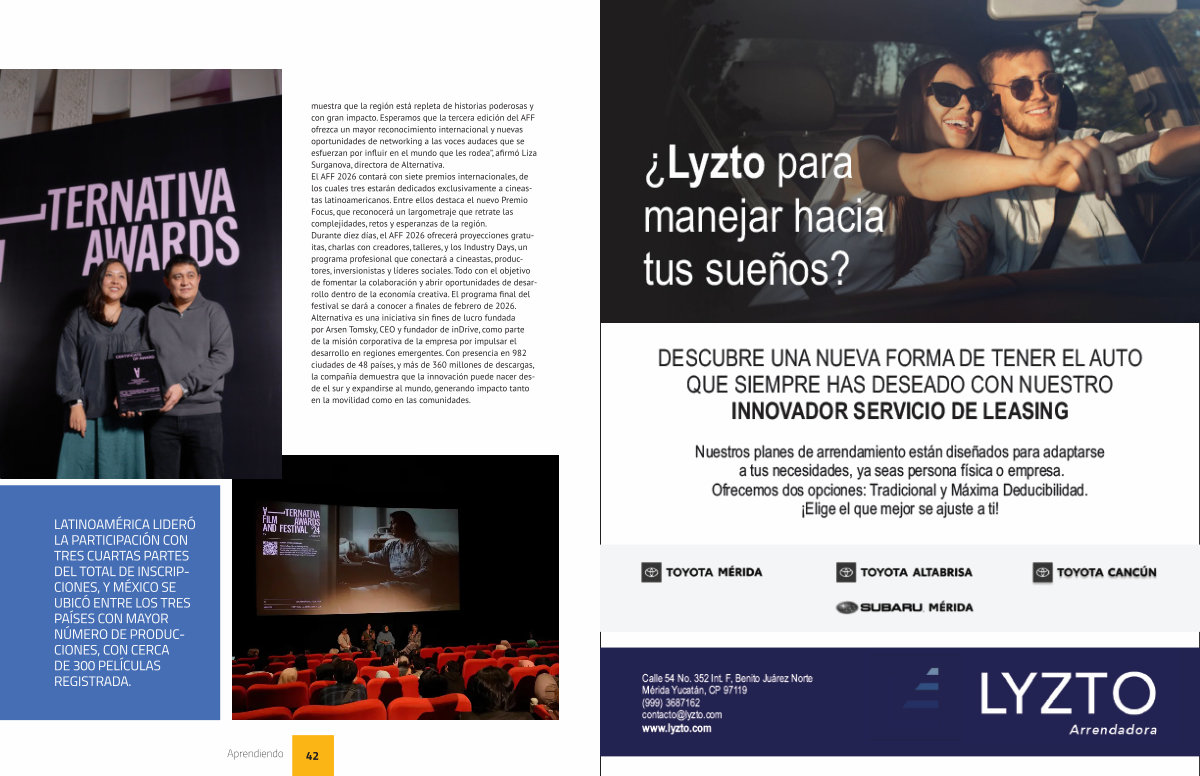 muestra que la región está repleta de historias poderosas y con gran impacto. Esperamos que la tercera edición del AFF ofrezca un mayor reconocimiento internacional y nuevas oportunidades de networking a las voces audaces que se esfuerzan por influir en el mundo que les rodea”, afirmó Liza Surganova, directora de Alternativa. El AFF 2026 contará con siete premios internacionales, de los cuales tres estarán dedicados exclusivamente a cineastas latinoamericanos. Entre ellos destaca el nuevo Premio Focus, que reconocerá un largometraje que retrate las complejidades, retos y esperanzas de la región. Durante diez días, el AFF 2026 ofrecerá proyecciones gratuitas, charlas con creadores, talleres, y los Industry Days, un programa profesional que conectará a cineastas, productores, inversionistas y líderes sociales. Todo con el objetivo de fomentar la colaboración y abrir oportunidades de desarrollo dentro de la economía creativa. El programa final del festival se dará a conocer a finales de febrero de 2026. Alternativa es una iniciativa sin fines de lucro fundada por Arsen Tomsky, CEO y fundador de inDrive, como parte de la misión corporativa de la empresa por impulsar el desarrollo en regiones emergentes. Con presencia en 982 ciudades de 48 países, y más de 360 millones de descargas, la compañía demuestra que la innovación puede nacer desde el sur y expandirse al mundo, generando impacto tanto en la movilidad como en las comunidades.