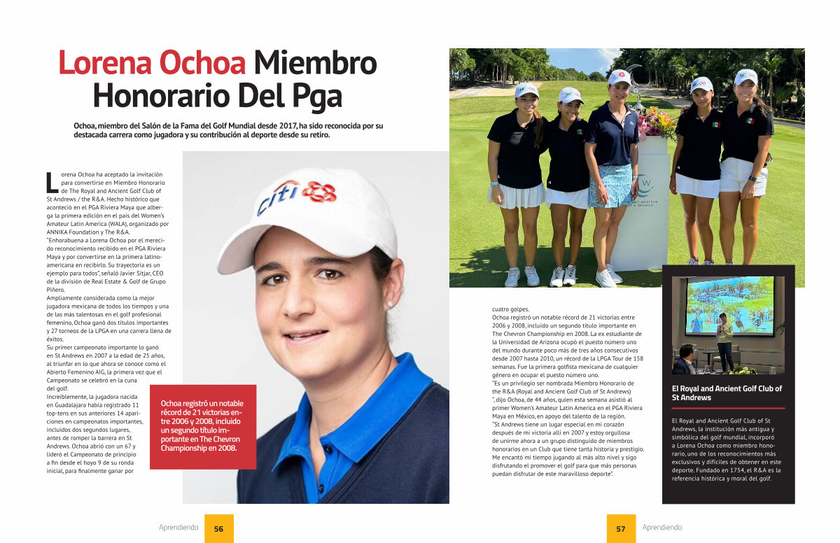 Lorena Ochoa ha aceptado la invitación para convertirse en Miembro Honorario de The Royal and Ancient Golf Club of St Andrews / the R & A. Hecho histórico que aconteció en el PGA Riviera Maya que alberga la primera edición en el país del Women’ s Amateur Latin America( WALA), organizado por ANNIKA Foundation y The R & A.“ Enhorabuena a Lorena Ochoa por el merecido reconocimiento recibido en el PGA Riviera Maya y por convertirse en la primera latinoamericana en recibirlo. Su trayectoria es un ejemplo para todos”, señaló Javier Sitjar, CEO de la división de Real Estate & Golf de Grupo Piñero. Ampliamente considerada como la mejor jugadora mexicana de todos los tiempos y una de las más talentosas en el golf profesional femenino, Ochoa ganó dos títulos importantes y 27 torneos de la LPGA en una carrera llena de éxitos. Su primer campeonato importante lo ganó en St Andrews en 2007 a la edad de 25 años, al triunfar en lo que ahora se conoce como el Abierto Femenino AIG, la primera vez que el Campeonato se celebró en la cuna del golf. Increíblemente, la jugadora nacida en Guadalajara había registrado 11 top-tens en sus anteriores 14 apariciones en campeonatos importantes, incluidos dos segundos lugares, antes de romper la barrera en St Andrews. Ochoa abrió con un 67 y lideró el Campeonato de principio a fin desde el hoyo 9 de su ronda inicial, para finalmente ganar por