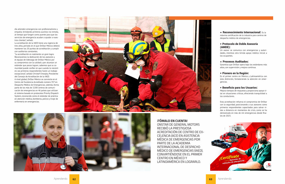 día atienden emergencias con profesionalismo y empatía; brindando primeros auxilios vía remota, al tiempo que fungen como puente para que los servicios de emergencia acudan a ayudar a nuestros clientes”, señaló. La acreditación de la IAED tiene una vigencia de tres años, periodo en el que OnStar México deberá mantener los 20 puntos de acreditación y cumplir con auditorías constantes.“ La acreditación es realmente un gran logro. Reconocemos la dedicación de los asesores y el equipo de liderazgo de OnStar México por su compromiso con la calidad y por alcanzar un estándar que pocos logran; sabemos que su comunidad puede confiar en que cuando lo necesiten, los primeros respondientes harán un trabajo excepcional”, señaló Christof Chwojka, Presidente del Consejo de Acreditación de la IAED. A nivel global, OnStar México se convierte en el Centro de Excelencia Acreditado número 357 en Despacho Médico de Emergencias; además, forma parte de los más de 3,500 centros de comunicación de emergencias en 46 países que utilizan el sistema basado en protocolos Priority Dispatch System, reconocido como el estándar de práctica en atención médica, bomberos, policía y triaje de enfermería en emergencias.