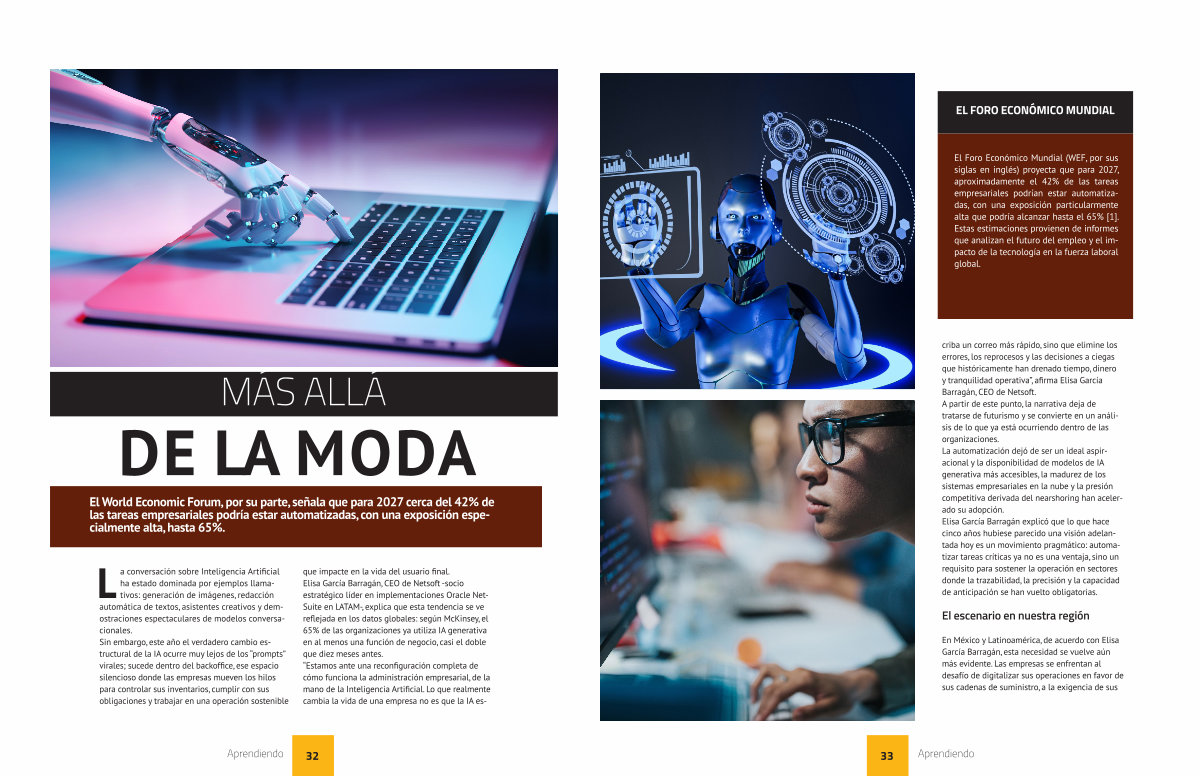 criba un correo más rápido, sino que elimine los errores, los reprocesos y las decisiones a ciegas que históricamente han drenado tiempo, dinero y tranquilidad operativa”, afirma Elisa García Barragán, CEO de Netsoft. A partir de este punto, la narrativa deja de tratarse de futurismo y se convierte en un análisis de lo que ya está ocurriendo dentro de las organizaciones. La automatización dejó de ser un ideal aspiracional y la disponibilidad de modelos de IA generativa más accesibles, la madurez de los sistemas empresariales en la nube y la presión competitiva derivada del nearshoring han acelerado su adopción. Elisa García Barragán explicó que lo que hace cinco años hubiese parecido una visión adelantada hoy es un movimiento pragmático: automatizar tareas críticas ya no es una ventaja, sino un requisito para sostener la operación en sectores donde la trazabilidad, la precisión y la capacidad de anticipación se han vuelto obligatorias.