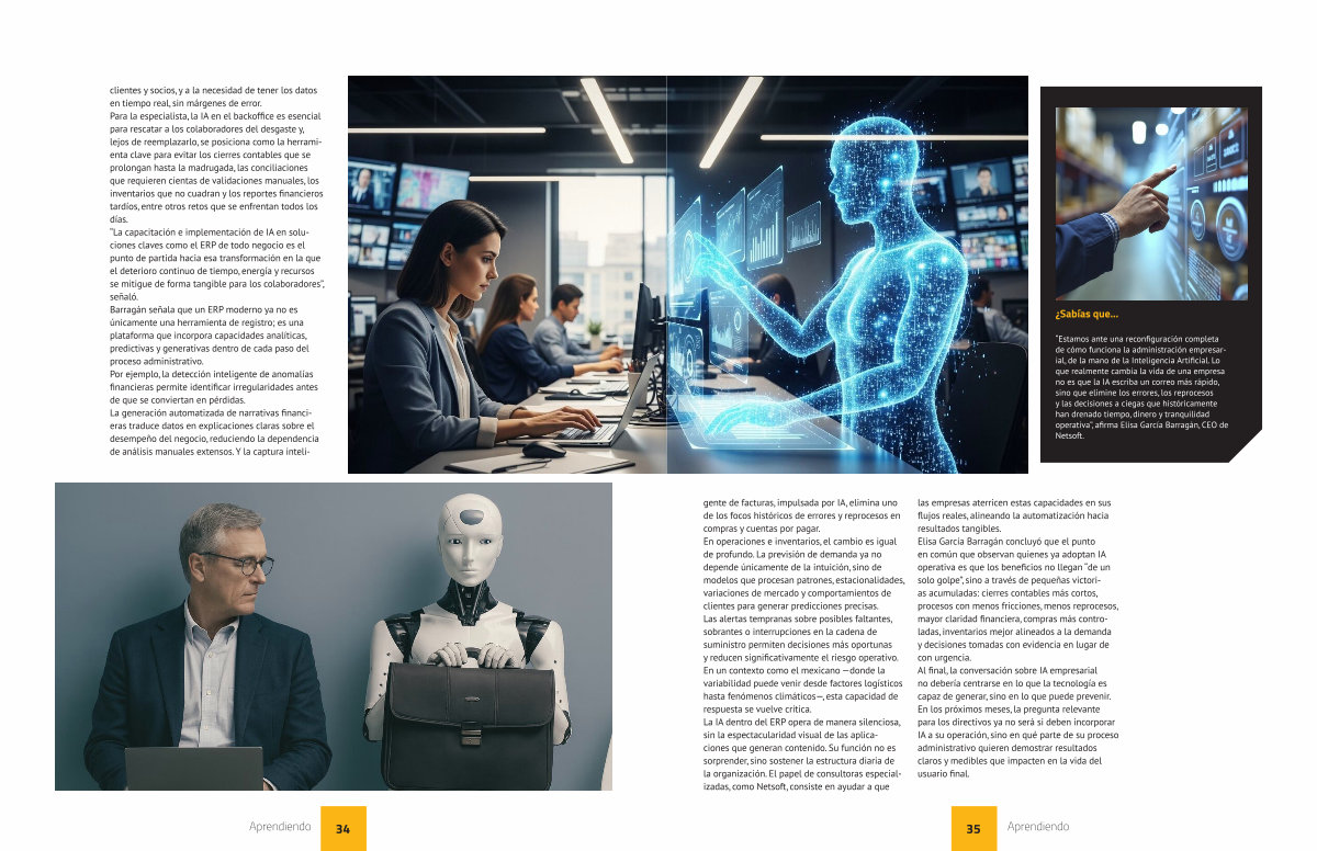 gente de facturas, impulsada por IA, elimina uno de los focos históricos de errores y reprocesos en compras y cuentas por pagar. En operaciones e inventarios, el cambio es igual de profundo. La previsión de demanda ya no depende únicamente de la intuición, sino de modelos que procesan patrones, estacionalidades, variaciones de mercado y comportamientos de clientes para generar predicciones precisas. Las alertas tempranas sobre posibles faltantes, sobrantes o interrupciones en la cadena de suministro permiten decisiones más oportunas y reducen significativamente el riesgo operativo. En un contexto como el mexicano— donde la variabilidad puede venir desde factores logísticos hasta fenómenos climáticos—, esta capacidad de respuesta se vuelve crítica. La IA dentro del ERP opera de manera silenciosa, sin la espectacularidad visual de las aplicaciones que generan contenido. Su función no es sorprender, sino sostener la estructura diaria de la organización. El papel de consultoras especializadas, como Netsoft, consiste en ayudar a que las empresas aterricen estas capacidades en sus flujos reales, alineando la automatización hacia resultados tangibles. Elisa García Barragán concluyó que el punto en común que observan quienes ya adoptan IA operativa es que los beneficios no llegan“ de un solo golpe”, sino a través de pequeñas victorias acumuladas: cierres contables más cortos, procesos con menos fricciones, menos reprocesos, mayor claridad financiera, compras más controladas, inventarios mejor alineados a la demanda y decisiones tomadas con evidencia en lugar de con urgencia. Al final, la conversación sobre IA empresarial no debería centrarse en lo que la tecnología es capaz de generar, sino en lo que puede prevenir. En los próximos meses, la pregunta relevante para los directivos ya no será si deben incorporar IA a su operación, sino en qué parte de su proceso administrativo quieren demostrar resultados claros y medibles que impacten en la vida del usuario final.