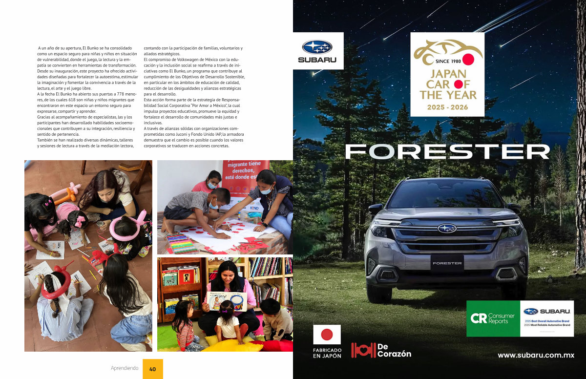 contando con la participación de familias, voluntarios y aliados estratégicos. El compromiso de Volkswagen de México con la educación y la inclusión social se reafirma a través de iniciativas como El Bunko, un programa que contribuye al cumplimiento de los Objetivos de Desarrollo Sostenible, en particular en los ámbitos de educación de calidad, reducción de las desigualdades y alianzas estratégicas para el desarrollo. Esta acción forma parte de la estrategia de Responsabilidad Social Corporativa“ Por Amor a México”, la cual impulsa proyectos educativos, promueve la equidad y fortalece el desarrollo de comunidades más justas e inclusivas. A través de alianzas sólidas con organizaciones comprometidas como Juconi y Fondo Unido IAP, la armadora demuestra que el cambio es posible cuando los valores corporativos se traducen en acciones concretas.