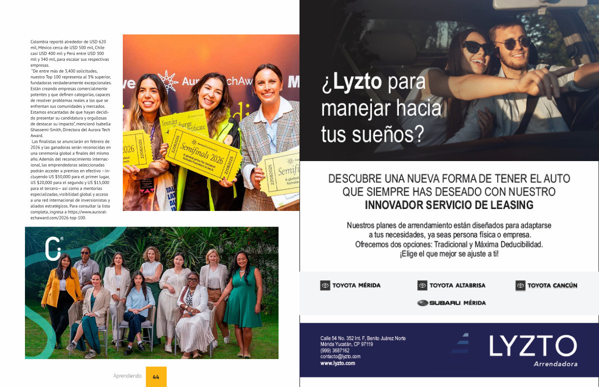Colombia reportó alrededor de USD 620 mil, México cerca de USD 500 mil, Chile casi USD 400 mil y Perú entre USD 300 mil y 340 mil, para escalar sus respectivas empresas.“ De entre más de 3,400 solicitudes, nuestro Top 100 representa al 3 % superior, fundadoras verdaderamente excepcionales. Están creando empresas comercialmente potentes y que definen categorías, capaces de resolver problemas reales a los que se enfrentan sus comunidades y mercados. Estamos encantadas de que hayan decidido presentar su candidatura y orgullosas de destacar su impacto”, mencionó Isabella Ghassemi-Smith, Directora del Aurora Tech Award. Las finalistas se anunciarán en febrero de 2026 y las ganadoras serán reconocidas en una ceremonia global a finales del mismo año. Además del reconocimiento internacional, las emprendedoras seleccionadas podrán acceder a premios en efectivo— incluyendo US $ 50,000 para el primer lugar, US $ 20,000 para el segundo y US $ 15,000 para el tercero— así como a mentorías especializadas, visibilidad global y acceso a una red internacional de inversionistas y aliados estratégicos. Para consultar la lista completa, ingresa a https:// www. auroratechaward. com / 2026-top-100.