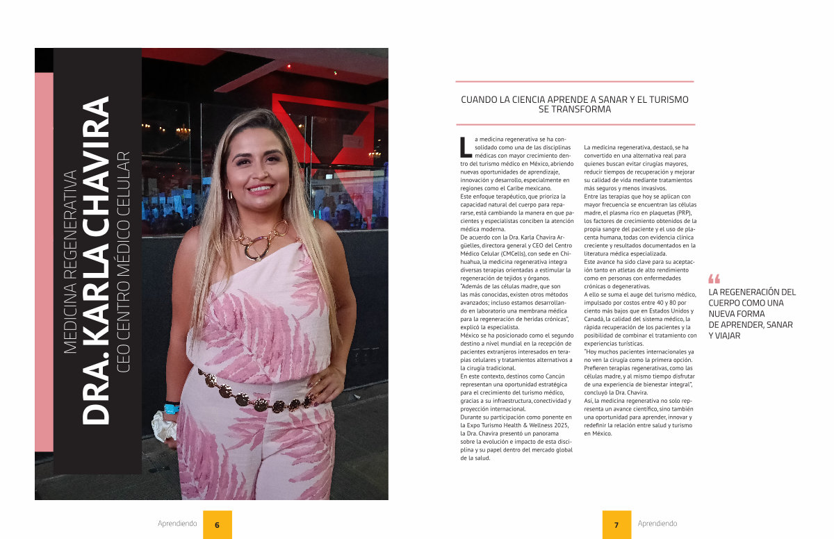 La medicina regenerativa se ha consolidado como una de las disciplinas médicas con mayor crecimiento dentro del turismo médico en México, abriendo nuevas oportunidades de aprendizaje, innovación y desarrollo, especialmente en regiones como el Caribe mexicano. Este enfoque terapéutico, que prioriza la capacidad natural del cuerpo para repararse, está cambiando la manera en que pacientes y especialistas conciben la atención médica moderna. De acuerdo con la Dra. Karla Chavira Argüelles, directora general y CEO del Centro Médico Celular( CMCells), con sede en Chihuahua, la medicina regenerativa integra diversas terapias orientadas a estimular la regeneración de tejidos y órganos.“ Además de las células madre, que son las más conocidas, existen otros métodos avanzados; incluso estamos desarrollando en laboratorio una membrana médica para la regeneración de heridas crónicas”, explicó la especialista. México se ha posicionado como el segundo destino a nivel mundial en la recepción de pacientes extranjeros interesados en terapias celulares y tratamientos alternativos a la cirugía tradicional. En este contexto, destinos como Cancún representan una oportunidad estratégica para el crecimiento del turismo médico, gracias a su infraestructura, conectividad y proyección internacional. Durante su participación como ponente en la Expo Turismo Health & Wellness 2025, la Dra. Chavira presentó un panorama sobre la evolución e impacto de esta disciplina y su papel dentro del mercado global de la salud.