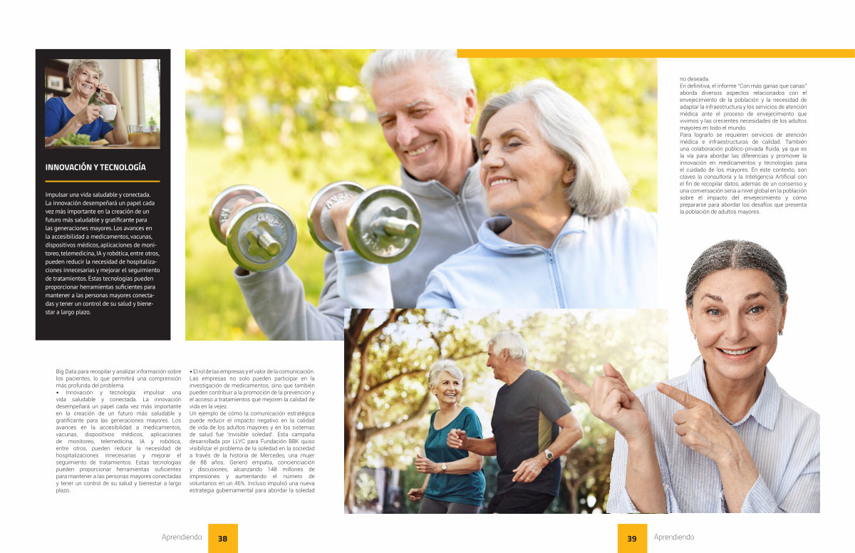 • Innovación y tecnología : impulsar una vida saludable y conectada . La innovación desempeñará un papel cada vez más importante en la creación de un futuro más saludable y gratificante para las generaciones mayores . Los avances en la accesibilidad a medicamentos , vacunas , dispositivos médicos , aplicaciones de monitoreo , telemedicina , IA y robótica , entre otros , pueden reducir la necesidad de hospitalizaciones innecesarias y mejorar el seguimiento de tratamientos . Estas tecnologías pueden proporcionar herramientas suficientes para mantener a las personas mayores conectadas y tener un control de su salud y bienestar a largo plazo .