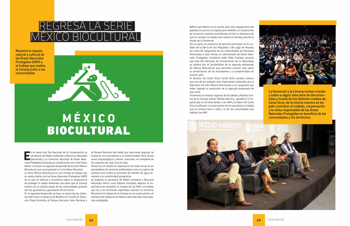 En el marco del Día Nacional de la Conservación , la Secretaría de Medio Ambiente y Recursos Naturales ( Semarnat ) y la Comisión Nacional de Áreas Naturales Protegidas ( Conanp ), en colaboración con Canal Once , dieron a conocer la segunda temporada de la serie México Biocultural , que se proyectará en la Cineteca Nacional . La serie México Biocultural es una mirada al trabajo que se realiza dentro de las Áreas Naturales Protegidas ( ANP ) en la que se informa y sensibiliza sobre la importancia de proteger el medio ambiente , una labor que la Conanp realiza con el valioso apoyo de las comunidades , quienes son las guardianas y guardianes del territorio . En la segunda temporada se hace un recorrido por distintas ANP como la Reserva de Biosfera El Triunfo , el Santuario Playa Escobilla , el Parque Nacional Islas Marietas y el Parque Nacional Isla Isabel , por mencionar algunas . Se muestran los ecosistemas y su biodiversidad : flora , fauna , zonas arqueológicas y bienes culturales , en compañía de los expertos de cada una de ellas . Asimismo , se resalta la importancia de estas zonas al ser proveedoras de servicios ambientales como la captura de carbono , aire limpio , la provisión de fuentes de agua , alimentos y la conectividad paisajística . Al respecto , la secretaria de Medio Ambiente y Recursos Naturales , María Luisa Albores González , destacó la importancia de compartir la imagen de las ANP y el trabajo que las y los directores regionales realizan en territorio . Reconoció el trabajo de la Conanp en la conservación y el esfuerzo del Gobierno de México para decretar más espacios protegidos .