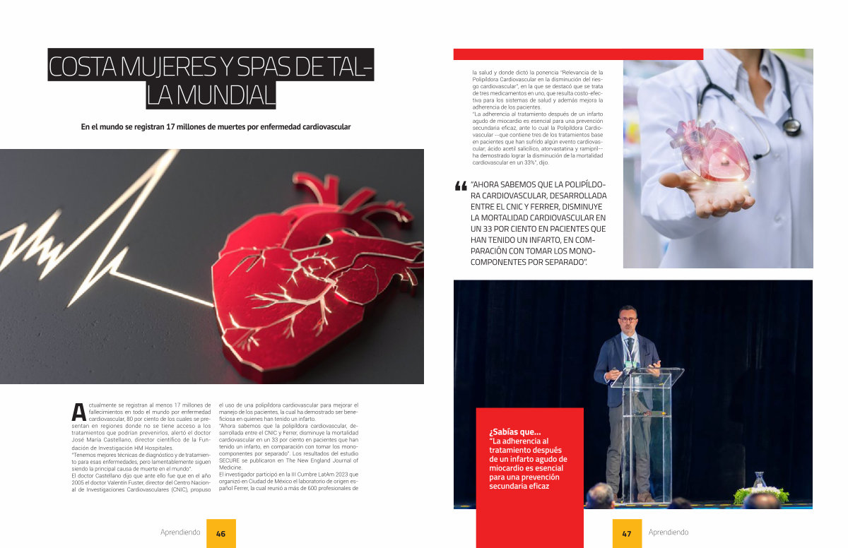 la salud y donde dictó la ponencia “ Relevancia de la Polipíldora Cardiovascular en la disminución del riesgo cardiovascular ”, en la que se destacó que se trata de tres medicamentos en uno , que resulta costo-efectiva para los sistemas de salud y además mejora la adherencia de los pacientes . “ La adherencia al tratamiento después de un infarto agudo de miocardio es esencial para una prevención secundaria eficaz , ante lo cual la Polipíldora Cardiovascular --que contiene tres de los tratamientos base en pacientes que han sufrido algún evento cardiovascular ; ácido acetil salicílico , atorvastatina y ramipril-- ha demostrado lograr la disminución de la mortalidad cardiovascular en un 33 %”, dijo .