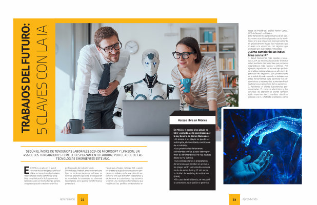 1 . Salud : Decisiones más rápidas y precisas : La IA ya está revolucionando el sector salud mediante herramientas que permiten diagnósticos más rápidos y certeros . Por ejemplo , algoritmos de aprendizaje profundo analizan radiografías con un alto nivel de precisión en segundos . Los profesionales de la salud deberán aprender a trabajar con estas herramientas para optimizar sus diagnósticos y tratamientos , aumentando así la eficiencia en el cuidado de los pacientes . 2 . Asistencia al cliente : Experiencias personalizadas : El comercio electrónico y los servicios de atención al cliente también están experimentando cambios drásticos gracias a la IA . Chatbots avanzados , como