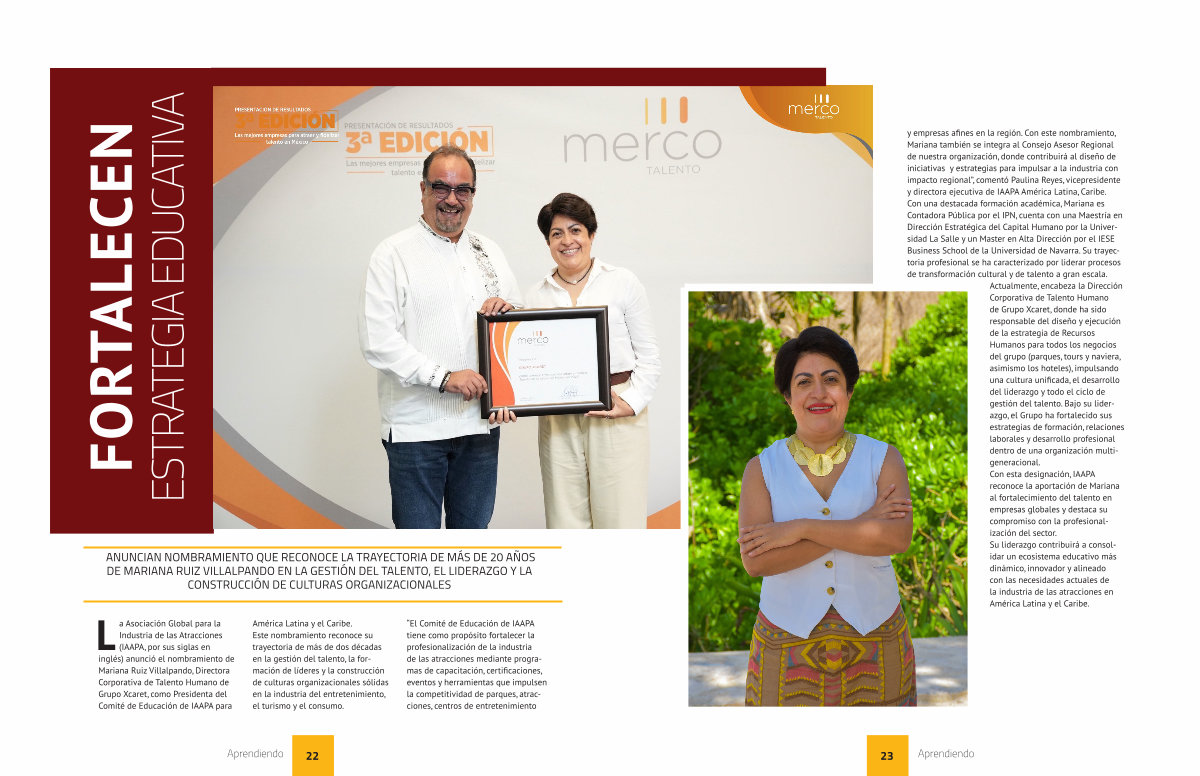La Asociación Global para la Industria de las Atracciones( IAAPA, por sus siglas en inglés) anunció el nombramiento de Mariana Ruiz Villalpando, Directora Corporativa de Talento Humano de Grupo Xcaret, como Presidenta del Comité de Educación de IAAPA para
