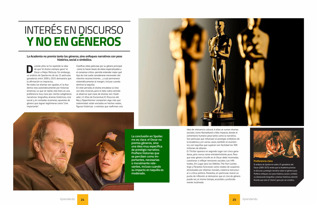 La conclusión en Spoi mx es clara: el Oscar n premia géneros, sino una idea muy específ de prestigio narrativo Prefiere historias que se perciben como importantes, necesarias o moralmente relevantes, incluso cuand su impacto en taquilla moderado.