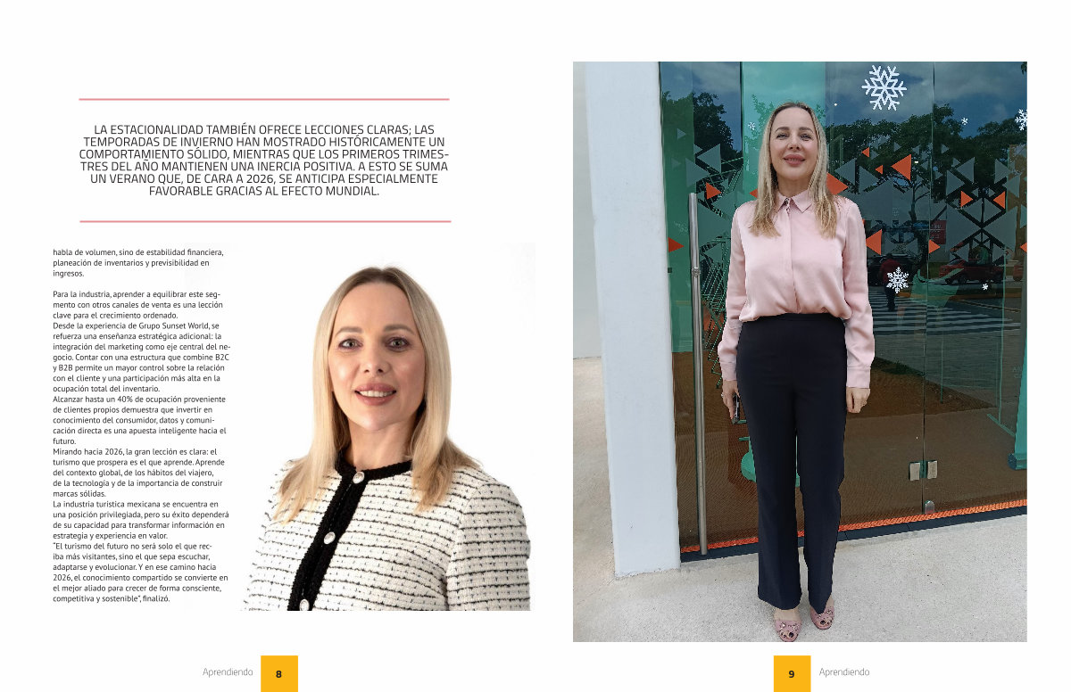 Para la industria, aprender a equilibrar este segmento con otros canales de venta es una lección clave para el crecimiento ordenado. Desde la experiencia de Grupo Sunset World, se refuerza una enseñanza estratégica adicional: la integración del marketing como eje central del negocio. Contar con una estructura que combine B2C y B2B permite un mayor control sobre la relación con el cliente y una participación más alta en la ocupación total del inventario. Alcanzar hasta un 40 % de ocupación proveniente de clientes propios demuestra que invertir en conocimiento del consumidor, datos y comunicación directa es una apuesta inteligente hacia el futuro. Mirando hacia 2026, la gran lección es clara: el turismo que prospera es el que aprende. Aprende del contexto global, de los hábitos del viajero, de la tecnología y de la importancia de construir marcas sólidas. La industria turística mexicana se encuentra en una posición privilegiada, pero su éxito dependerá de su capacidad para transformar información en estrategia y experiencia en valor.“ El turismo del futuro no será solo el que reciba más visitantes, sino el que sepa escuchar, adaptarse y evolucionar. Y en ese camino hacia 2026, el conocimiento compartido se convierte en el mejor aliado para crecer de forma consciente, competitiva y sostenible”, finalizó.