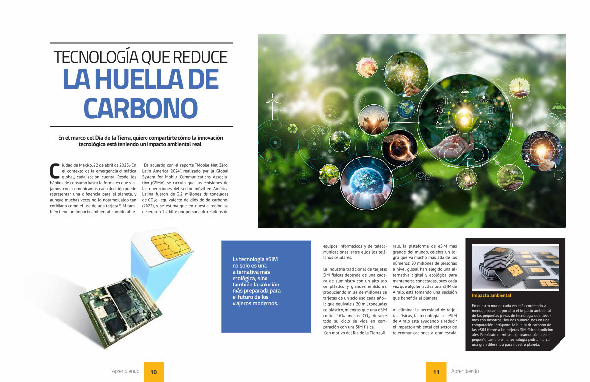 La industria tradicional de tarjetas SIM físicas depende de una cadena de suministro con un alto uso de plástico y grandes emisiones, produciendo miles de millones de tarjetas de un solo uso cada año— lo que equivale a 20 mil toneladas de plástico, mientras que una eSIM emite 46 % menos CO₂ durante todo su ciclo de vida en comparación con una SIM física. Con motivo del Día de la Tierra, Airalo, la plataforma de eSIM más grande del mundo, celebra un logro que va mucho más allá de los números: 20 millones de personas a nivel global han elegido una alternativa digital y ecológica para mantenerse conectadas, pues cada vez que alguien activa una eSIM de Airalo, está tomando una decisión que beneficia al planeta.
