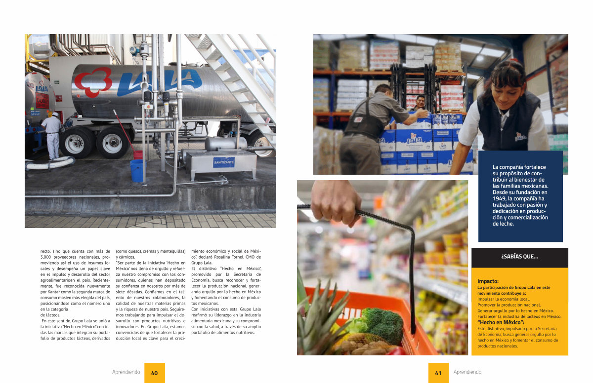recto, sino que cuenta con más de 3,000 proveedores nacionales, promoviendo así el uso de insumos locales y desempeña un papel clave en el impulso y desarrollo del sector agroalimentarioen el país. Recientemente, fue reconocida nuevamente por Kantar como la segunda marca de consumo masivo más elegida del país, posicionándose como el número uno en la categoría de lácteos. En este sentido, Grupo Lala se unió a la iniciativa“ Hecho en México” con todas las marcas que integran su portafolio de productos lácteos, derivados