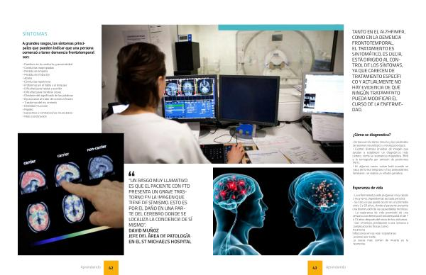“ UN RASGO MUY LLAMATIVO ES QUE EL PACIENTE CON FTD PRESENTA UN GRAVE TRAS- TORNO EN LA IMAGEN QUE TIENE DE SÍ MISMO . ESTO ES POR EL DAÑO EN UNA PAR- TE DEL CEREBRO DONDE SE LOCALIZA LA CONCIENCIA DE SÍ MISMO ”. DAVID MUÑOZ JEFE DEL ÁREA DE PATOLOGÍA EN EL ST MICHAEL ’ S HOSPITAL