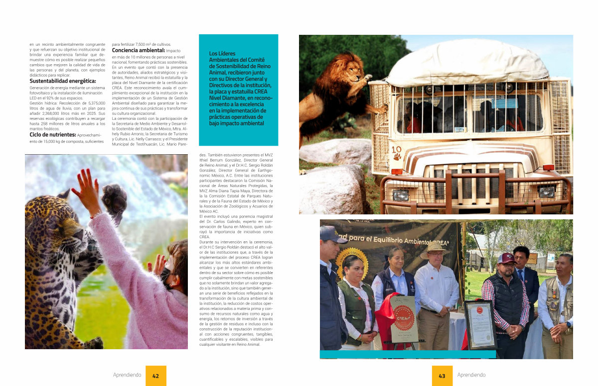 Los Líderes Ambientales del Comité de Sostenibilidad de Reino Animal , recibieron junto con su Director General y Directivos de la institución , la placa y estatuilla CREA Nivel Diamante , en reconocimiento a la excelencia en la implementación de prácticas operativas de bajo impacto ambiental en más de 10 millones de personas a nivel nacional , fomentando prácticas sostenibles . En un evento que contó con la presencia de autoridades , aliados estratégicos y visitantes , Reino Animal recibió la estatuilla y la placa del Nivel Diamante de la certificación CREA . Este reconocimiento avala el cumplimiento excepcional de la institución en la implementación de un Sistema de Gestión Ambiental diseñado para garantizar la mejora continua de sus prácticas y transformar su cultura organizacional . La ceremonia contó con la participación de la Secretaria de Medio Ambiente y Desarrollo Sostenible del Estado de México , Mtra . Alhely Rubio Arronis ; la Secretaria de Turismo y Cultura , Lic . Nelly Carrasco ; y el Presidente Municipal de Teotihuacán , Lic . Mario Paredes . También estuvieron presentes el MVZ Ithiel Berrum González , Director General de Reino Animal , y el Dr . H . C . Sergio Roldán González , Director General de Earthgonomic México , A . C . Entre las instituciones participantes destacaron la Comisión Nacional de Áreas Naturales Protegidas , la MVZ Alma Diana Tapia Maya , Directora de la la Comisión Estatal de Parques Naturales y de la Fauna del Estado de México y la Asociación de Zoológicos y Acuarios de México AC . El evento incluyó una ponencia magistral del Dr . Carlos Galindo , experto en conservación de fauna en México , quien subrayó la importancia de iniciativas como CREA . Durante su intervención en la ceremonia , el Dr . H . C Sergio Roldán destacó el alto valor de las instituciones que , a través de la implementación del proceso CREA logran alcanzar los más altos estándares ambientales y que se convierten en referentes dentro de su sector sobre cómo es posible cumplir cabalmente con metas sostenibles que no solamente brindan un valor agregado a la institución , sino que también generan una serie de beneficios reflejados en la transformación de la cultura ambiental de la institución , la reducción de costos operativos relacionados a materia prima y consumo de recursos naturales como agua y energía , los retornos de inversión a través de la gestión de residuos e incluso con la construcción de la reputación institucional con acciones congruentes , tangibles , cuantificables y escalables , visibles para cualquier visitante en Reino Animal .