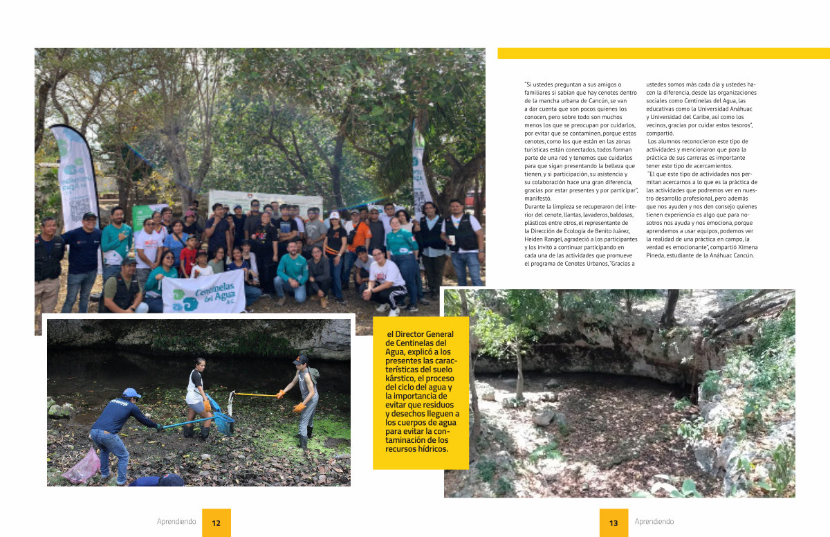 “ Si ustedes preguntan a sus amigos o familiares si sabían que hay cenotes dentro de la mancha urbana de Cancún, se van a dar cuenta que son pocos quienes los conocen, pero sobre todo son muchos menos los que se preocupan por cuidarlos, por evitar que se contaminen, porque estos cenotes, como los que están en las zonas turísticas están conectados, todos forman parte de una red y tenemos que cuidarlos para que sigan presentando la belleza que tienen, y si participación, su asistencia y su colaboración hace una gran diferencia, gracias por estar presentes y por participar”, manifestó. Durante la limpieza se recuperaron del interior del cenote, llantas, lavaderos, baldosas, plásticos entre otros, el representante de la Dirección de Ecología de Benito Juárez, Heiden Rangel, agradeció a los participantes y los invitó a continuar participando en cada una de las actividades que promueve el programa de Cenotes Urbanos,“ Gracias a ustedes somos más cada día y ustedes hacen la diferencia, desde las organizaciones sociales como Centinelas del Agua, las educativas como la Universidad Anáhuac y Universidad del Caribe, así como los vecinos, gracias por cuidar estos tesoros”, compartió. Los alumnos reconocieron este tipo de actividades y mencionaron que para la práctica de sus carreras es importante tener este tipo de acercamientos.“ El que este tipo de actividades nos permitan acercarnos a lo que es la práctica de las actividades que podremos ver en nuestro desarrollo profesional, pero además que nos ayuden y nos den consejo quienes tienen experiencia es algo que para nosotros nos ayuda y nos emociona, porque aprendemos a usar equipos, podemos ver la realidad de una práctica en campo, la verdad es emocionante”, compartió Ximena Pineda, estudiante de la Anáhuac Cancún. or General elas del plicó a los s las caracdel suelo el proceso del agua y ancia de e residuos os lleguen a os de agua ar la conón de los hídricos.